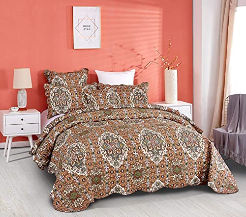 DaDa Bedding Earthy Cross Motif Folk Bedspread - Cozy Arabian Moroccan Ogee Rustic Antique Style Quilted Coverlet Set - Scalloped Edges Warm Tones Burnt Orange Brown Olive Green - King - 3-Pieces