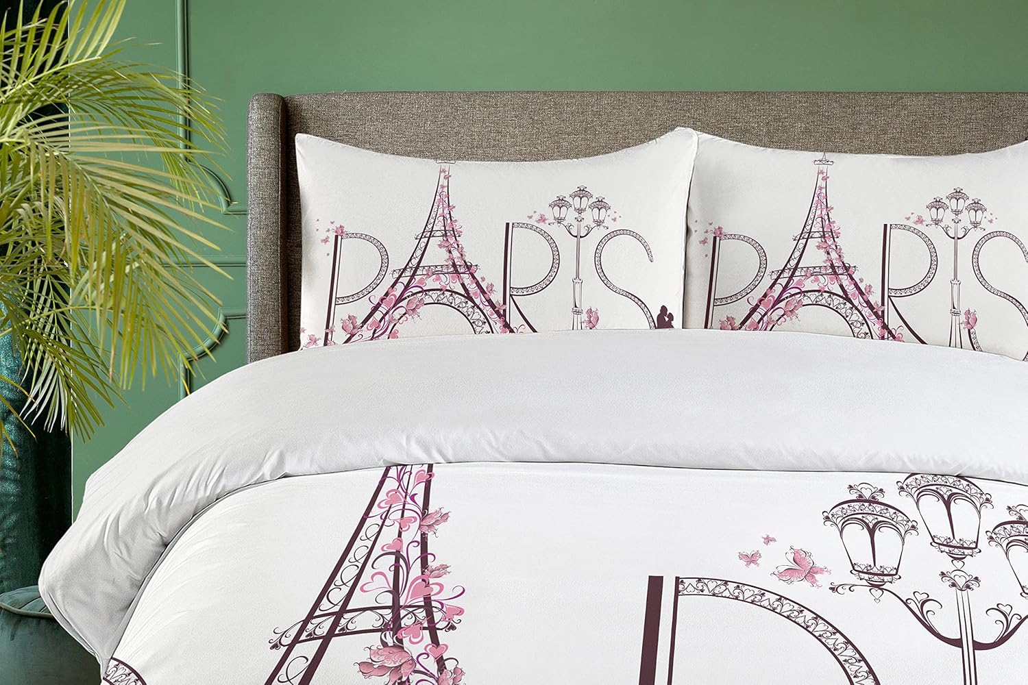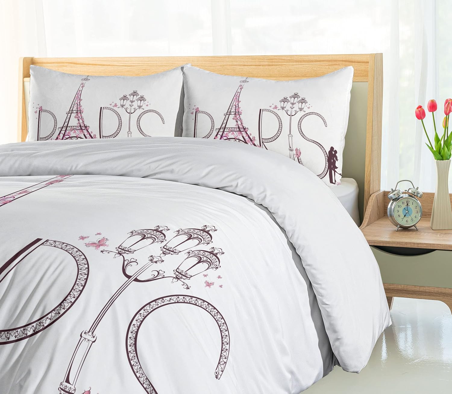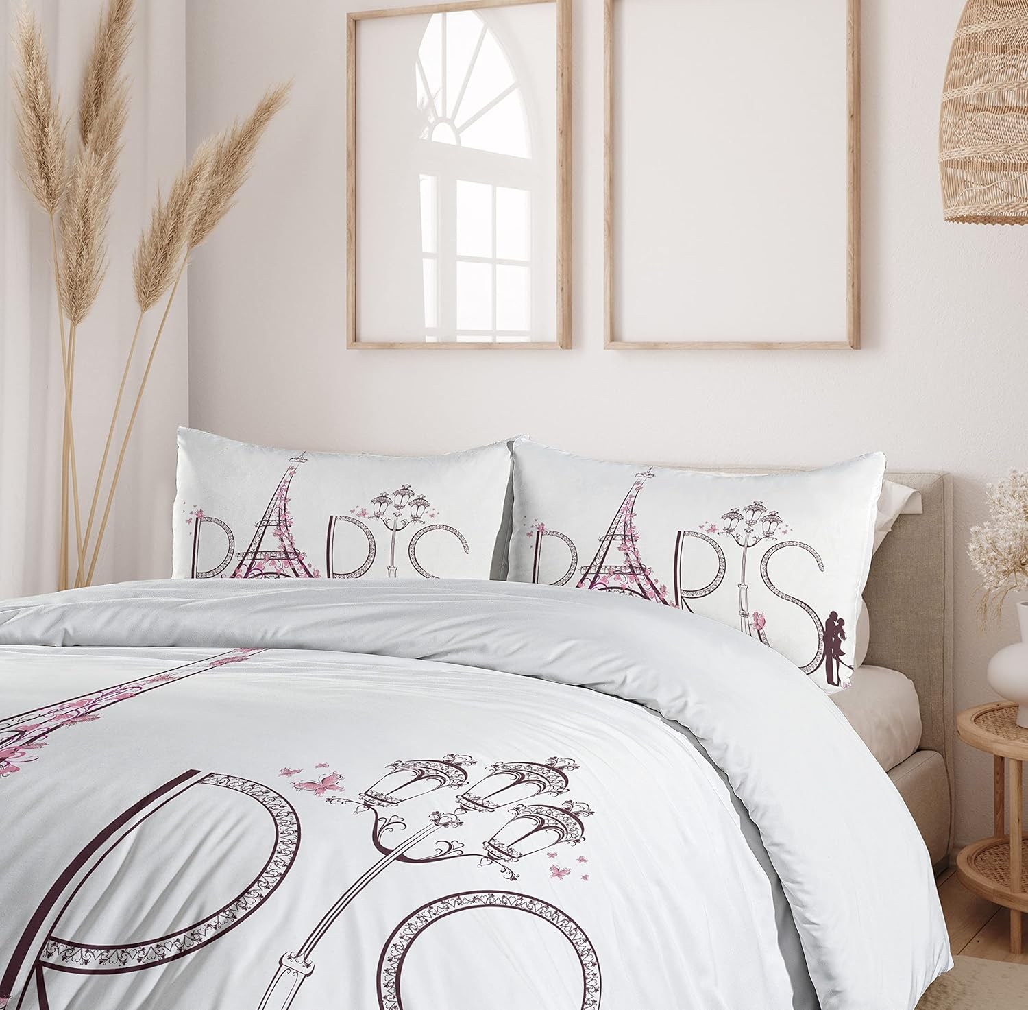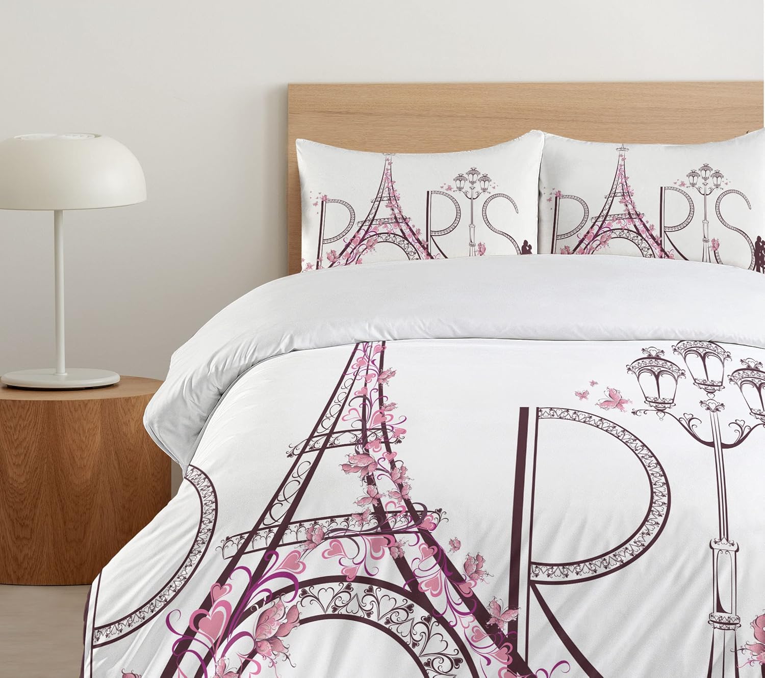 Ambesonne Paris Duvet Cover Set, Tower Eiffel with Paris Lettering Couple Trip Flowers Floral Design Print, Decorative 3 Piece Bedding Set with 2 Pillow Shams, Queen Size, Pink Plum