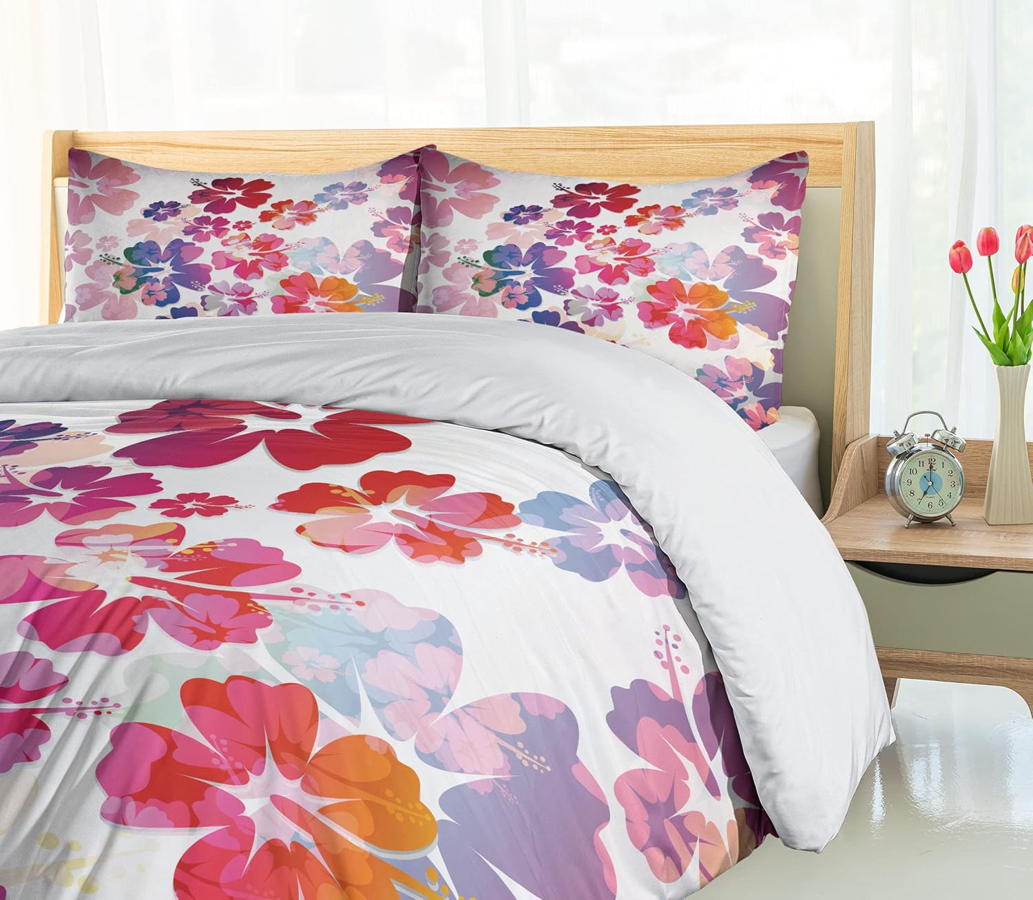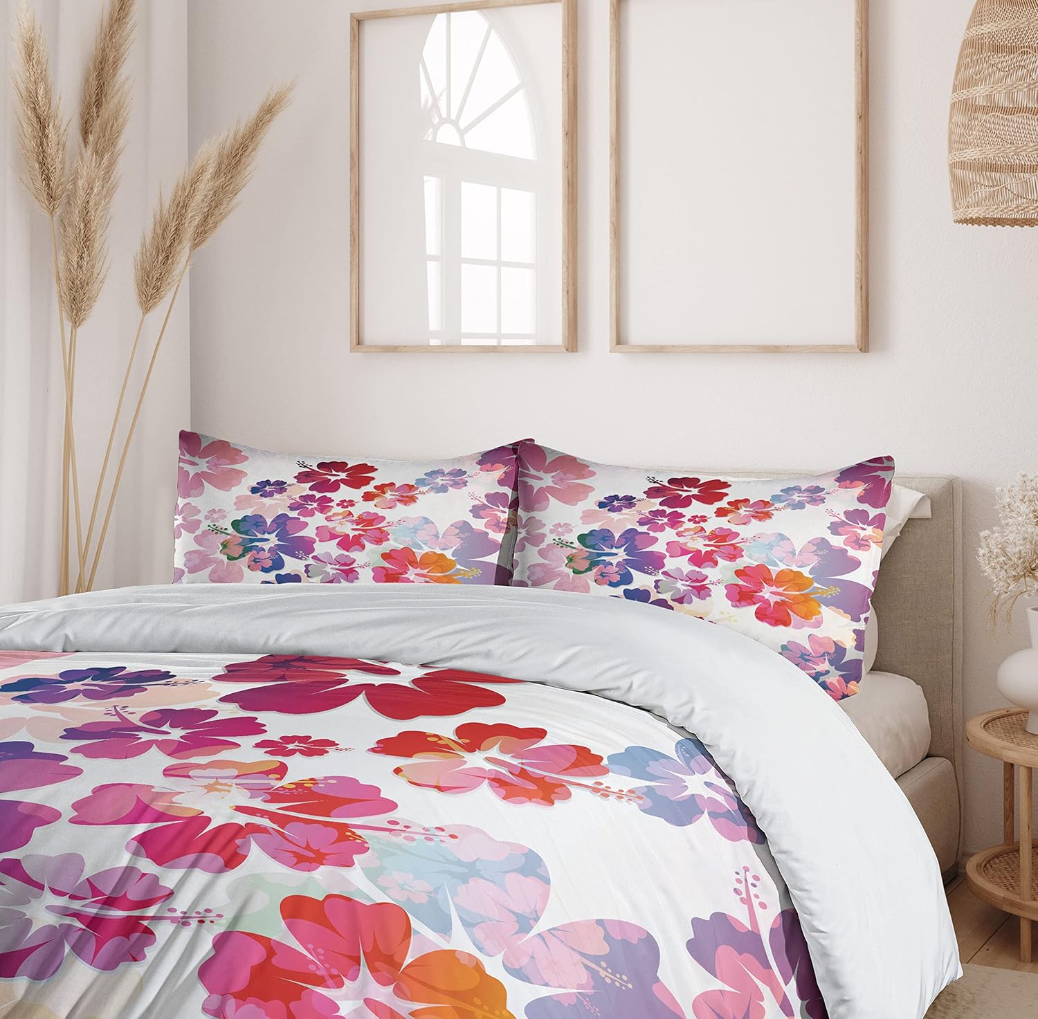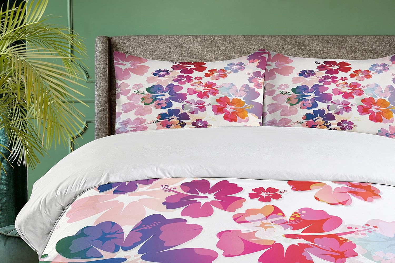 Ambesonne Hawaiian Duvet Cover Set, Exotic Floral Island Theme Tropical Hawaii Flowers Pattern Print, Decorative 2 Piece Bedding Set with 1 Pillow Sham, Twin Size, Purple Pale Pink and Orange