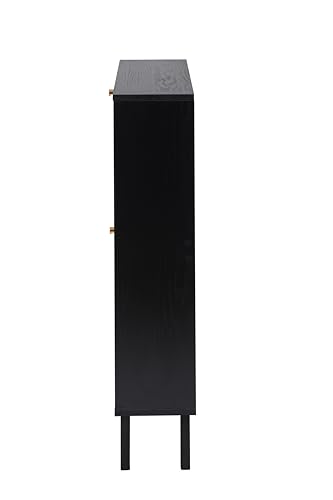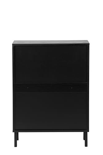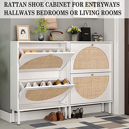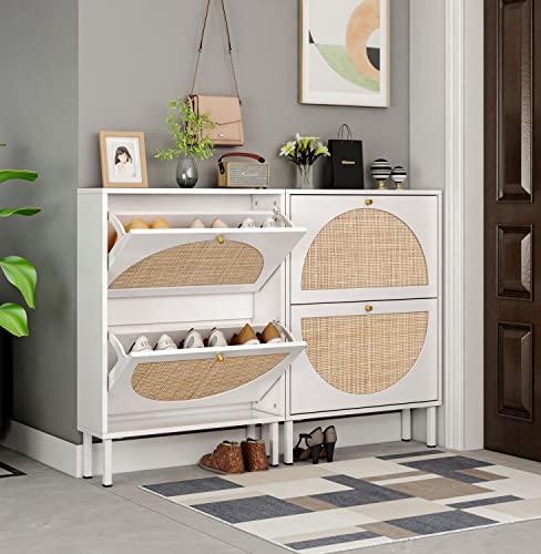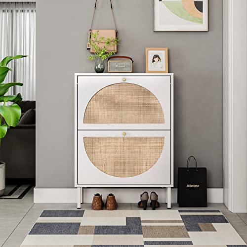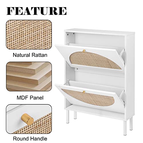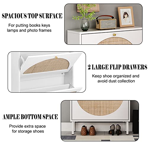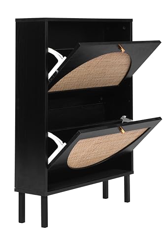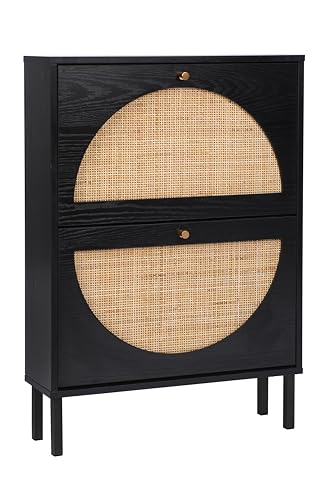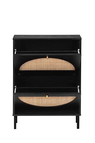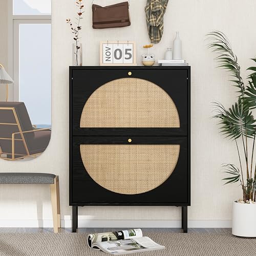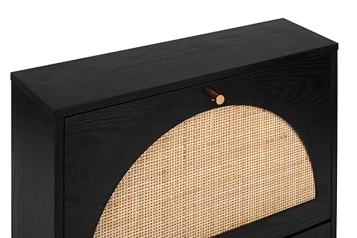 Shoe Cabinet with 2 Flip Drawers, Narrow Entryway Shoe Organizer Rattan Doors, Free Standing Shoe Rack for Entryway Hallway, Slim Shoe Rack Storage Cabinet for Heels Slippers Black