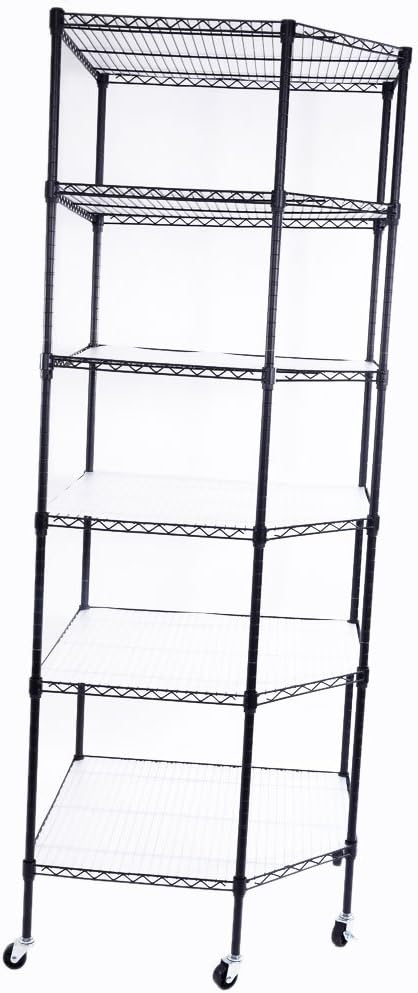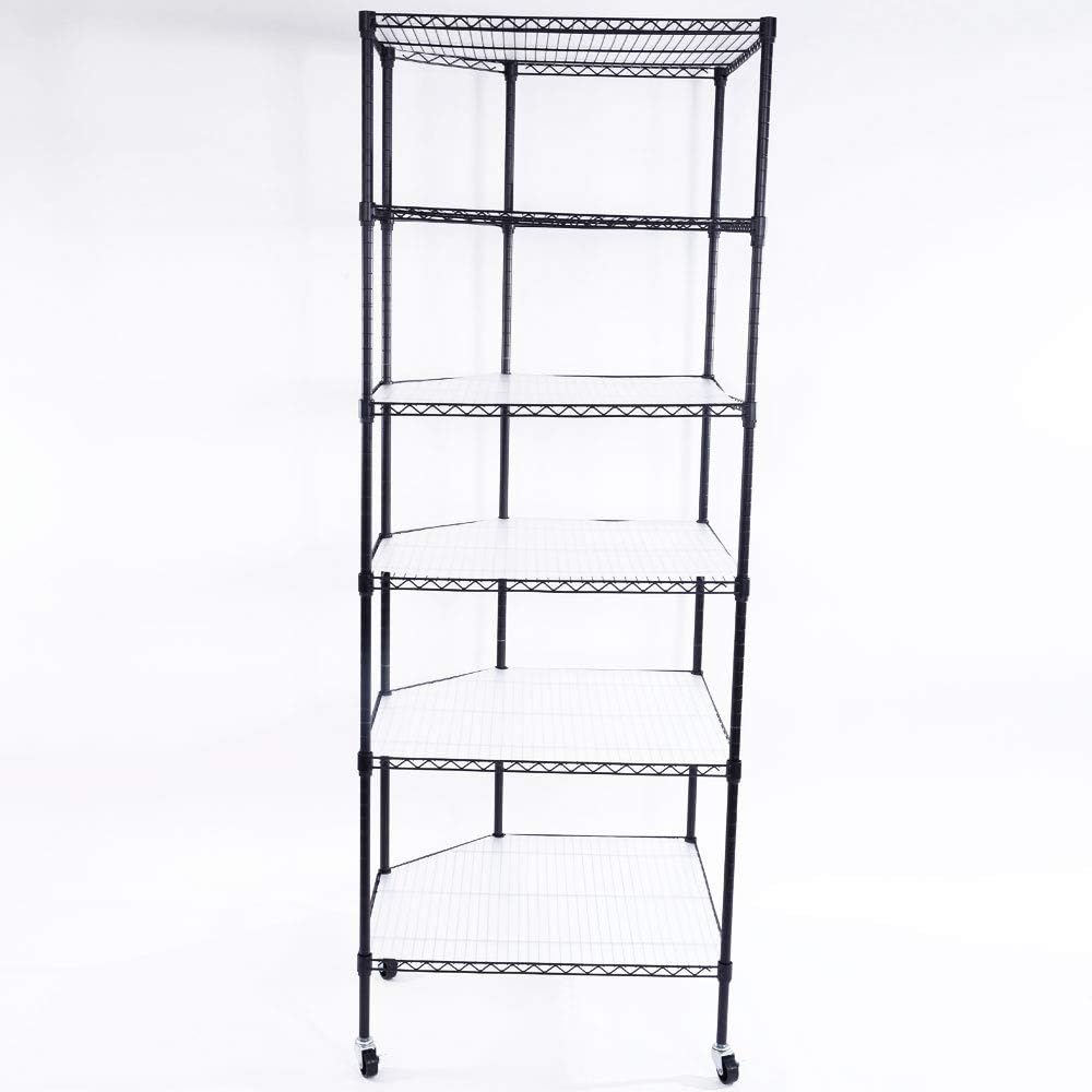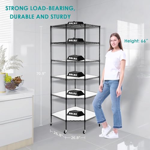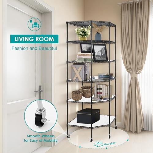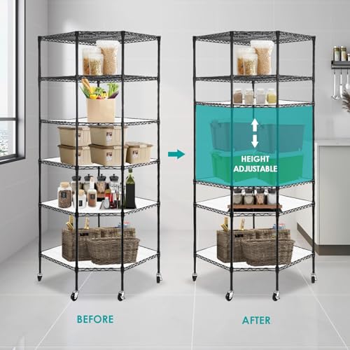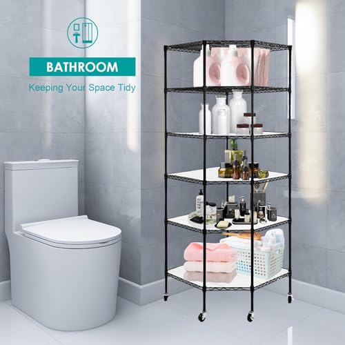 6 Tier Metal Corner Shelf, Polygonal Corner Wire Shelf with Wheels and PP Panels, Adjustable Heavy Duty Corner Storage Shelf for Garage, Basement, Kitchen, Living Room, 27" W X 27" D X 71" H, Black