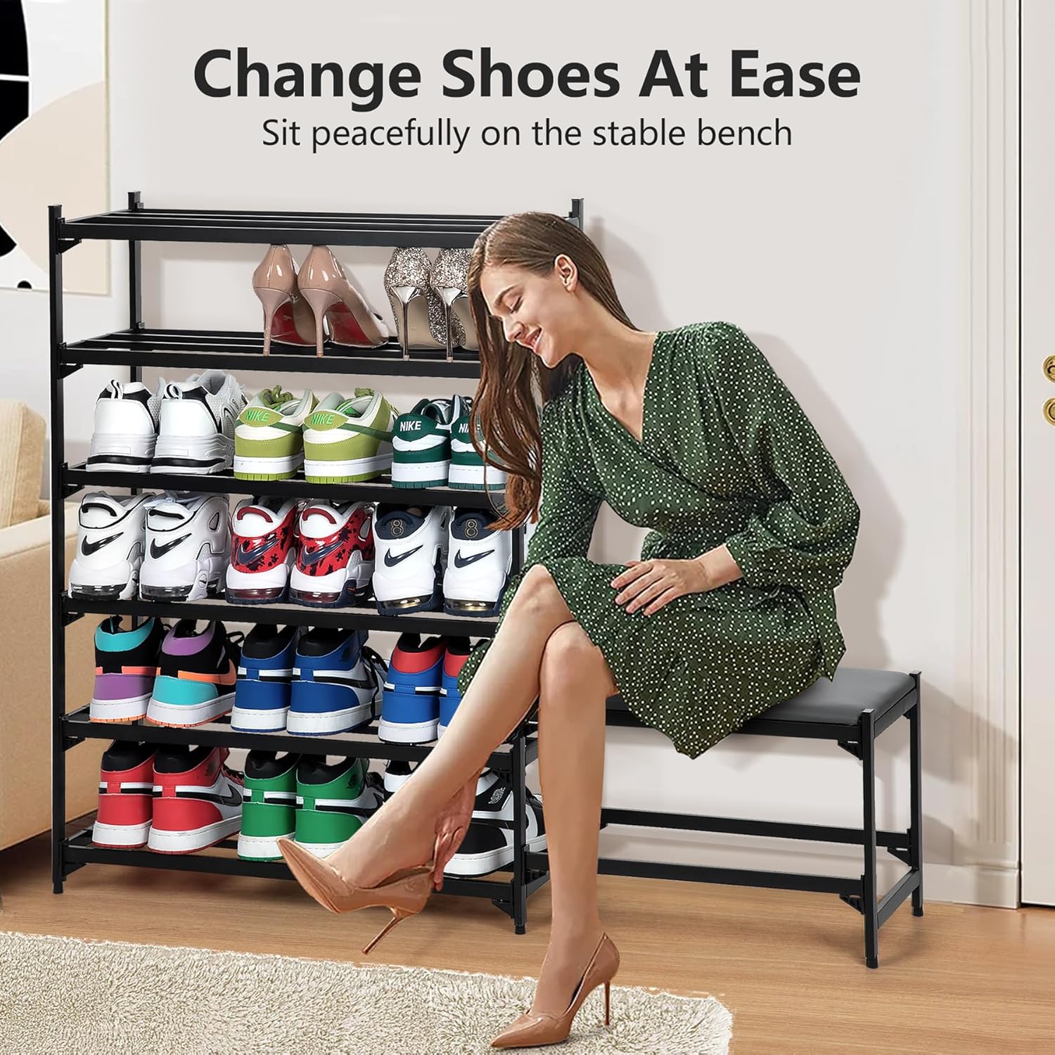 Shoe Rack with Bench, 6-Tier Shoe Storage Bench, Entryway Bench, Holds Up to 400 lb, Space-Saving Shoe Organizers Without Screws,Shoe Rack Bench for Entryway Bathroom Bedroom