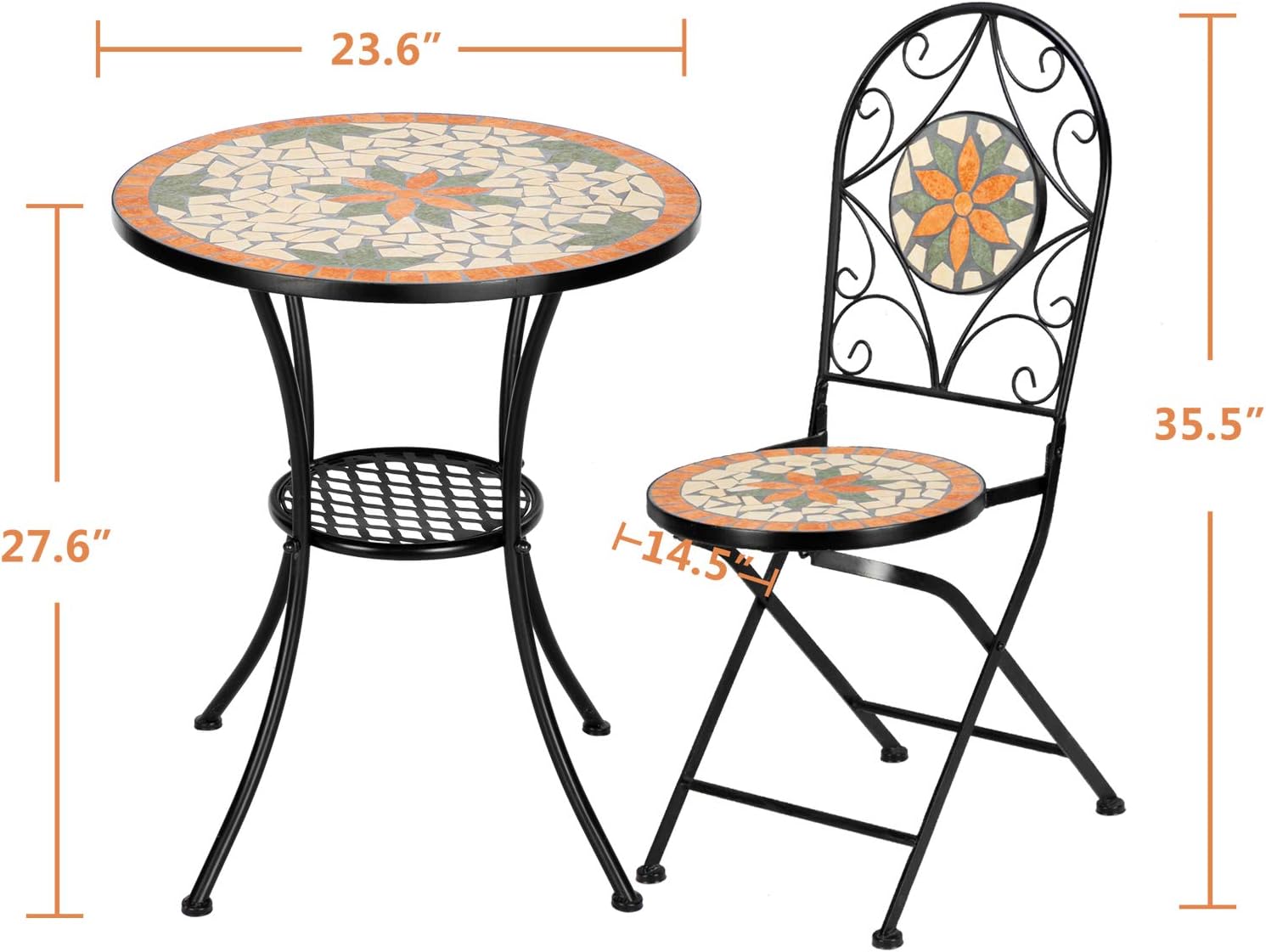 VINGLI 3 Pieces Garden Patio Mosaic Table, Outdoor Bistro Set with Folding Chairs,Black Iron Frame