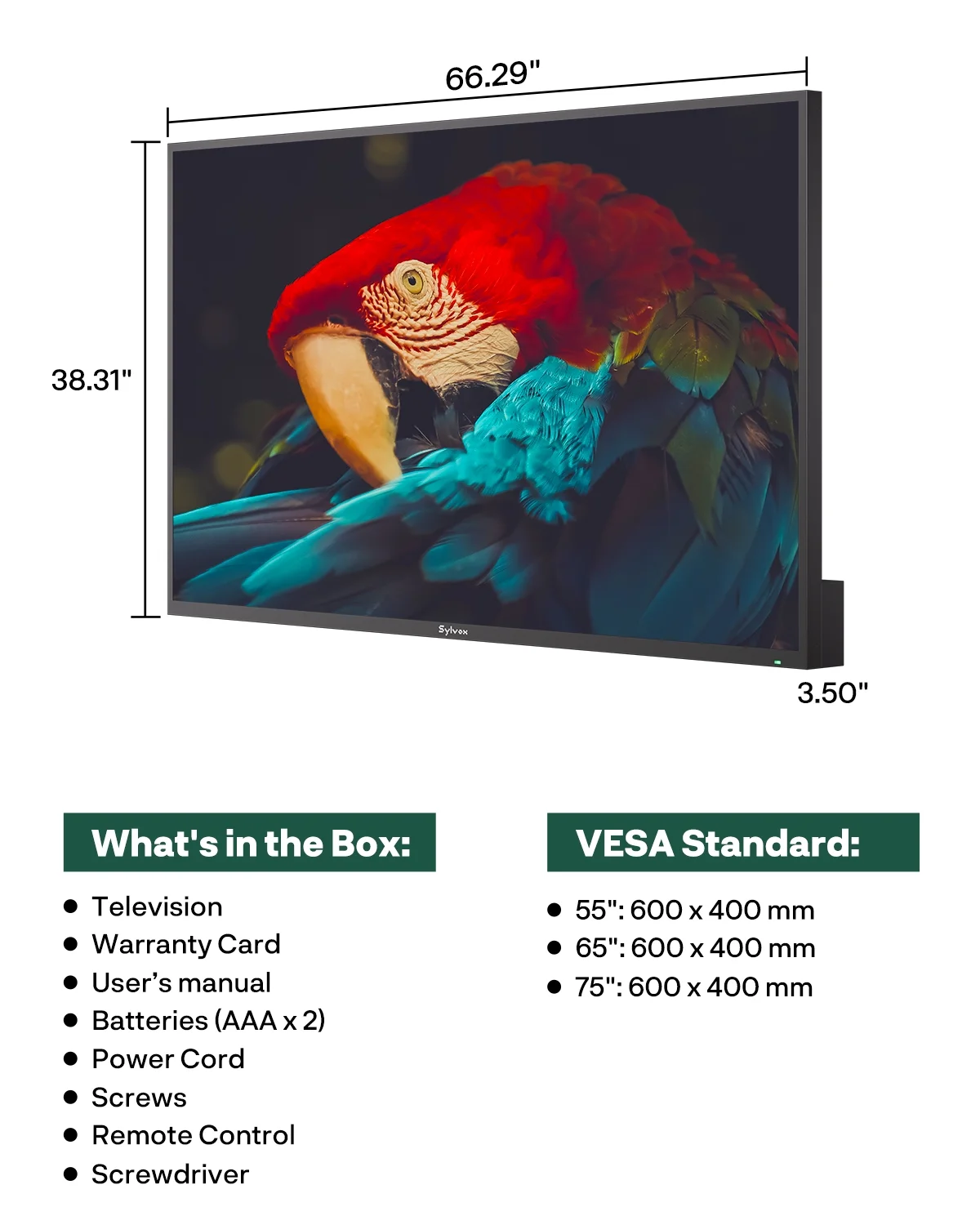 SYLVOX 65 inch Outdoor Mini-LED QLED TV, 4K UHD Smart Google TV, 2000 Nits Full Sun, 120Hz Refresh Rate, IP55 Waterproof, Dual 30W Dolby Atmos Speaks (Cinema/2025)