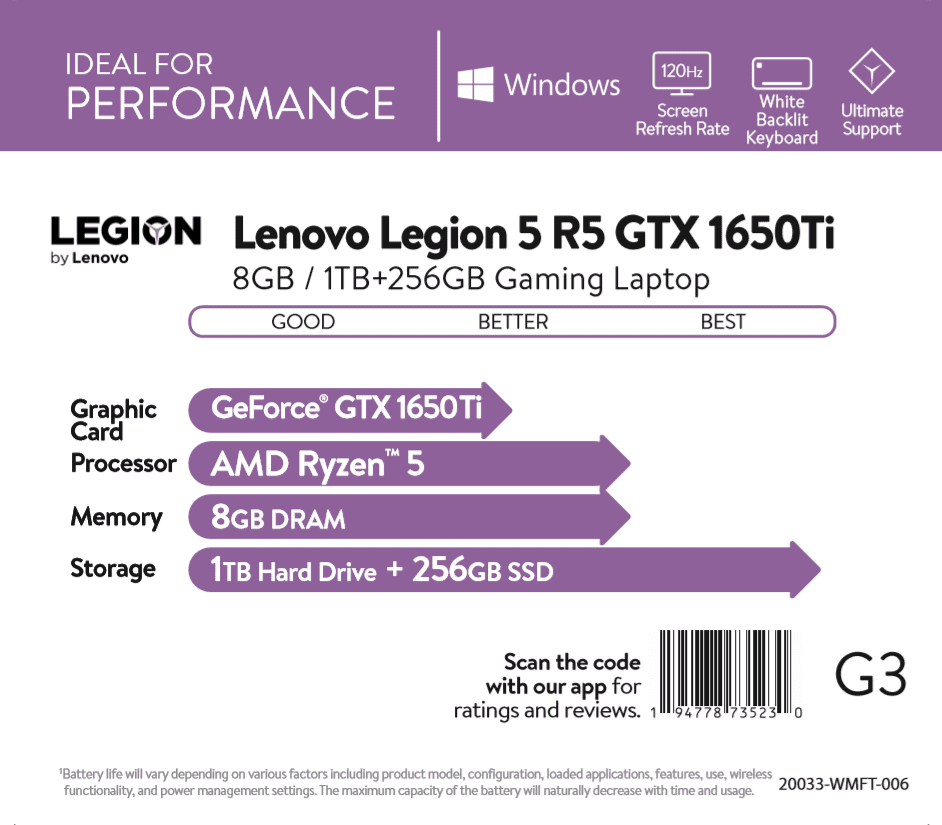 "Lenovo Legion 5, 15.6"" FHD, AMD Ryzen 5, GTX 1650Ti, 8GB, 256GB SSD, 1TB HD - 82B5001XUS"