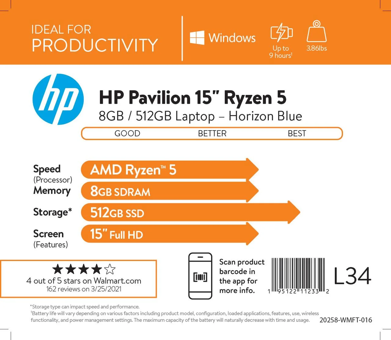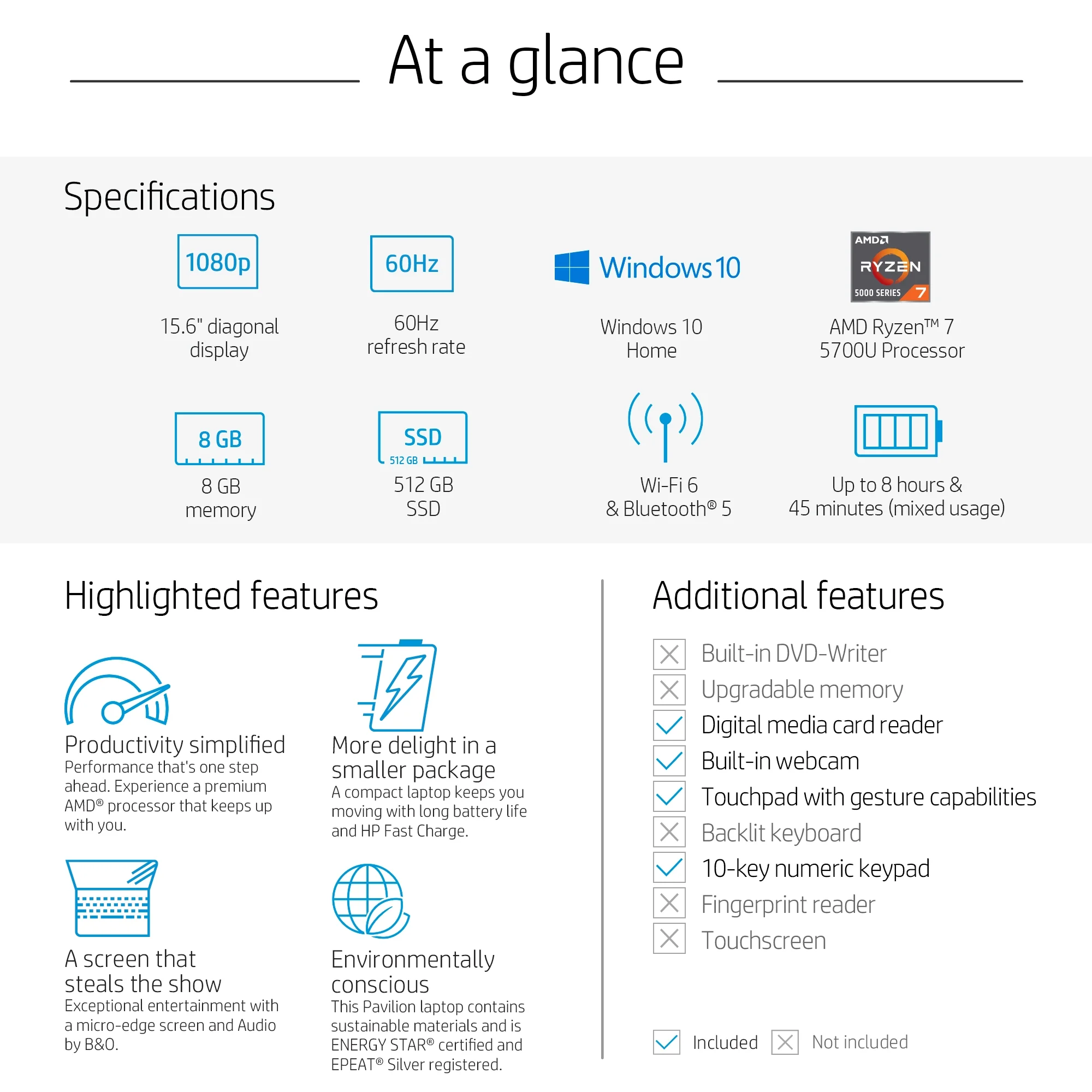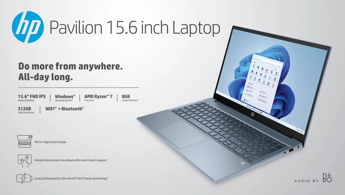 "HP Pavilion 15.6"" FHD Laptop, AMD Ryzen 7, 8GB RAM, 512GB SSD, Windows 11, Horizon Blue"