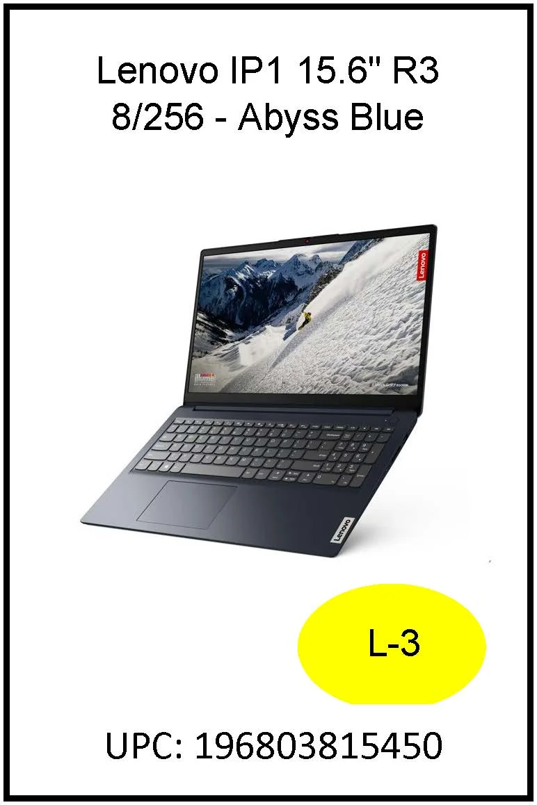 Lenovo Slim Ideapad 1, 15.6 inch Laptop, AMD Ryzen 3-7320U, 8GB RAM, 256GB SSD, Abyss Blue