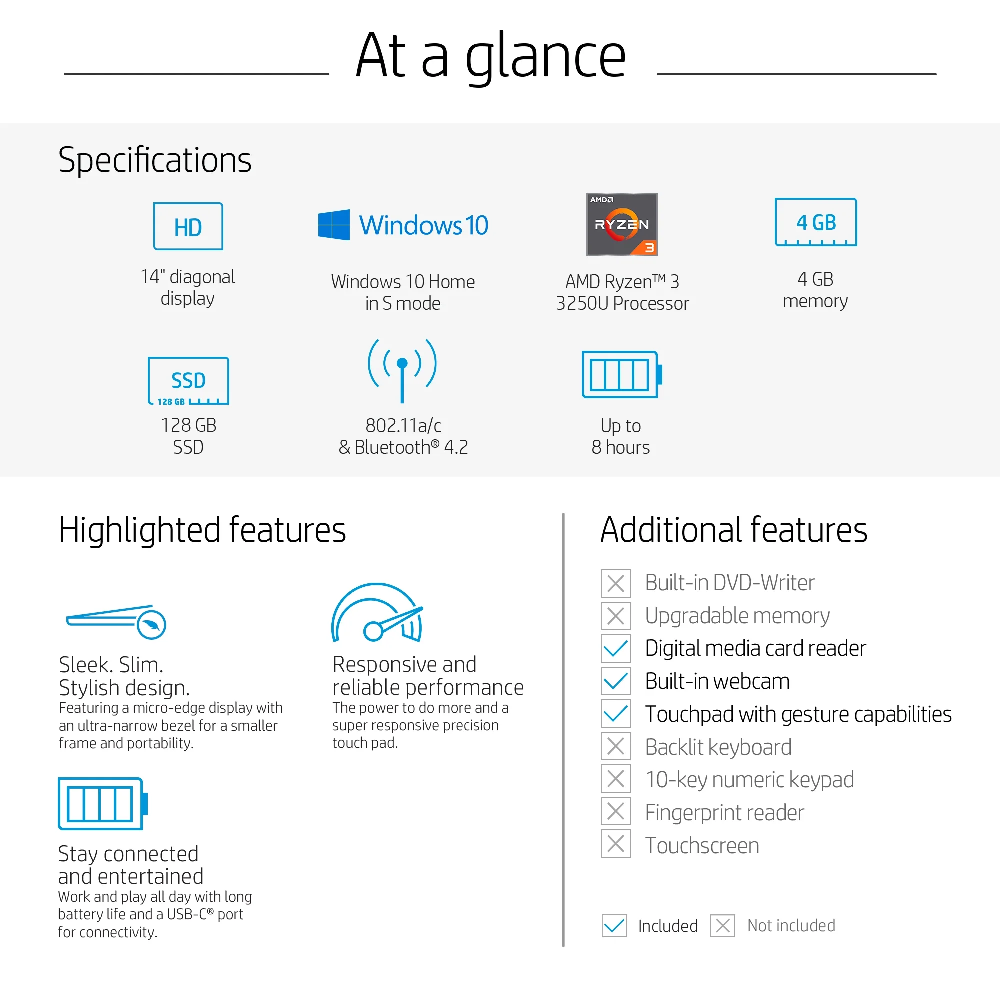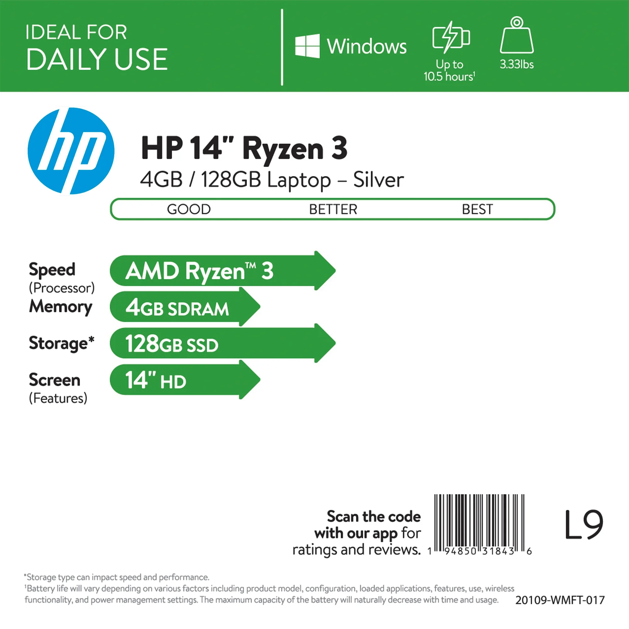 "HP 14"" Lightweight Thin Laptop, AMD Ryzen 3, 4GB/128GB, Silver (Google Classroom Compatible)"