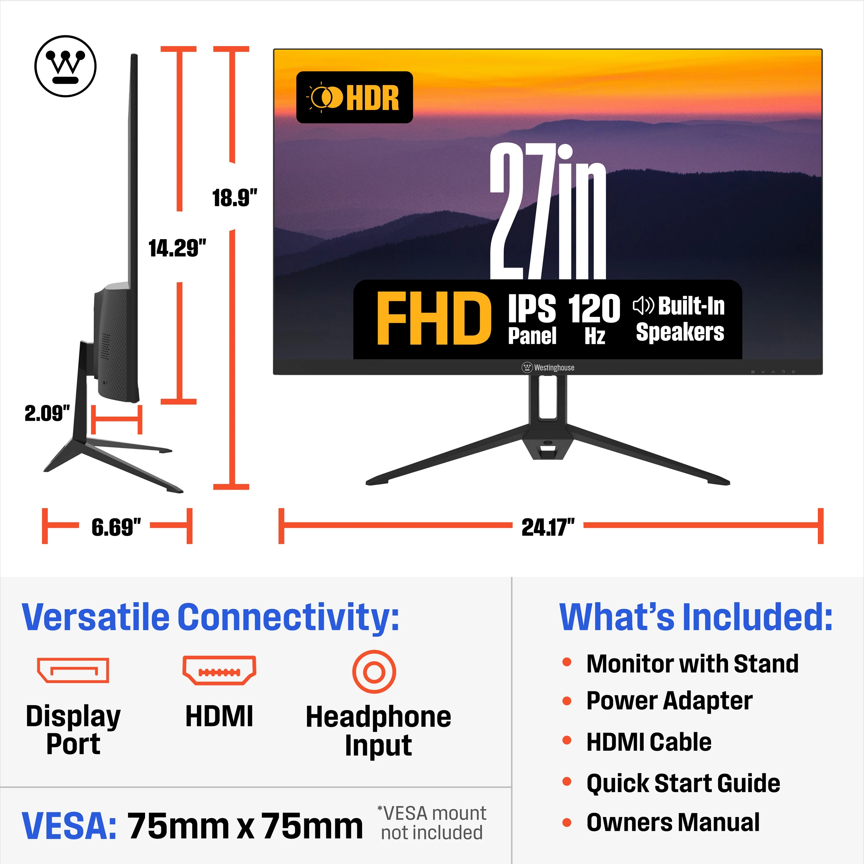 Westinghouse 27 Inch Monitor, 1080p Full HD IPS Computer Screen, 120Hz Refresh Rate, 1ms Response, HDR, Adaptive Sync, Built-in Speakers, HDMI, DP, Gaming & Home Office (2025 Model)