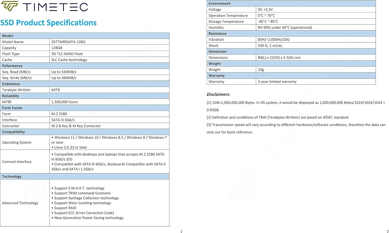 Timetec 128GB SSD, 3D NAND, M.2 2280 SATA III 6Gb/s, Read 550MB/s, 64TBW, Internal Drive