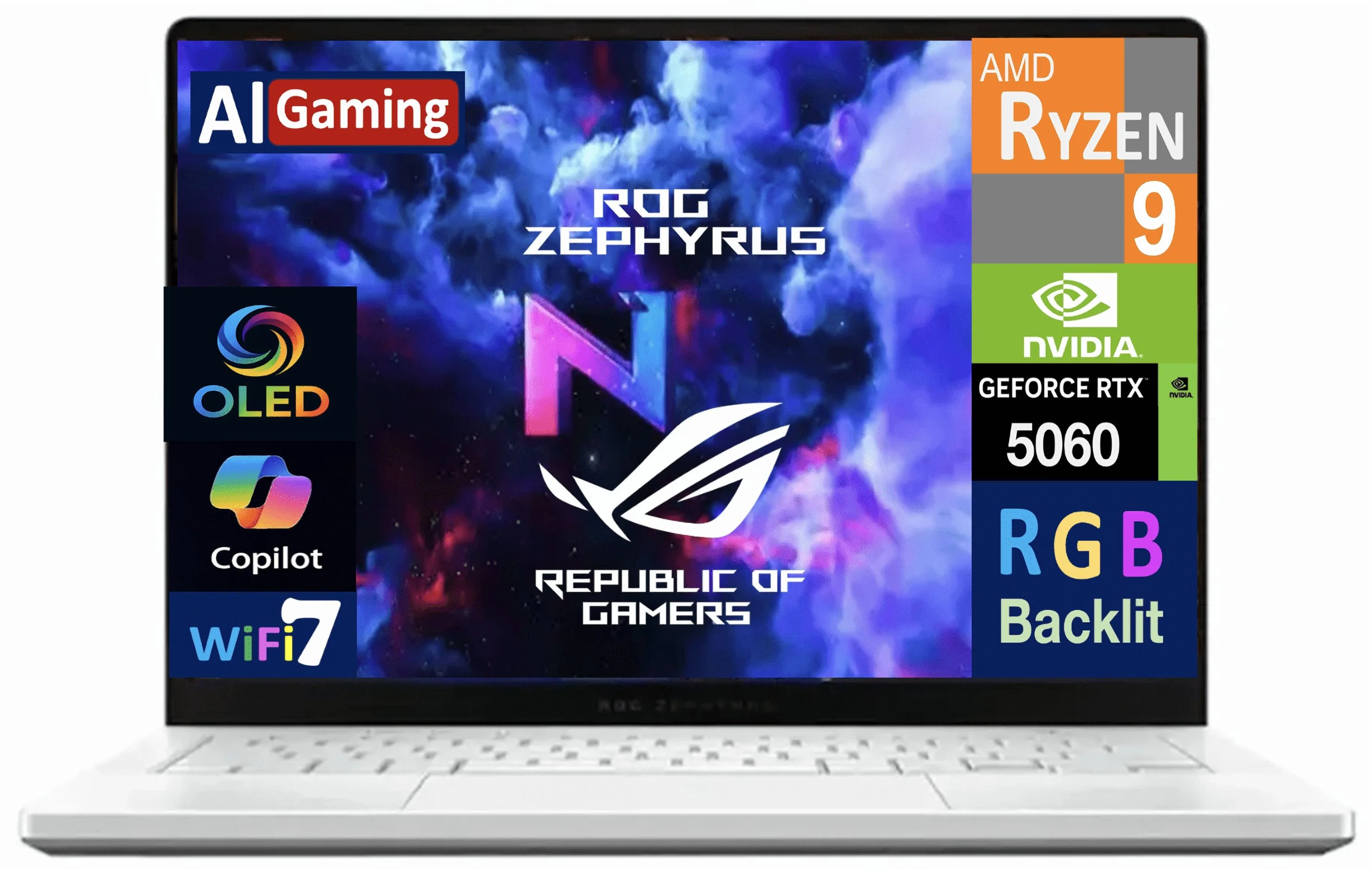 ASUS ROG Zephyrus AI Gaming Laptop 14.0in 120Hz OLED 2.8K Display (AMD Ryzen 9 270, NVIDIA GeForce RTX 5060 8GB, 16GB LPDDR5X, 2TB PCIe SSD, RGB KB, WiFi 7, Webcam, Bluetooth 5.4, Win 11 Pro)