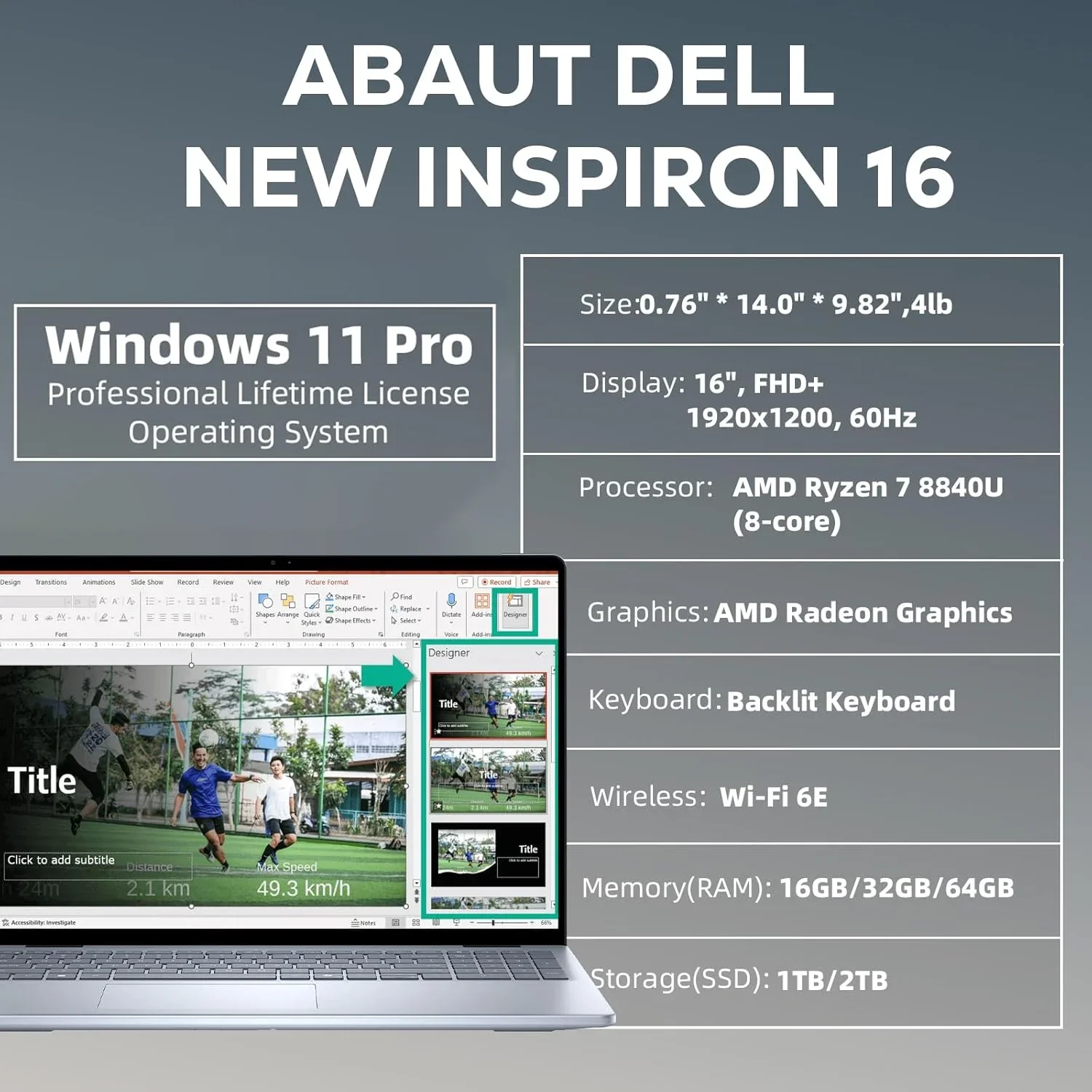 Dell Inspiron 16 Business Laptop, 16" FHD+ Display, AMD Ryzen 7-8840U, 64GB DDR5 RAM, 2TB SSD, Wi-Fi 6E, Backlit KB, Windows 11 Pro