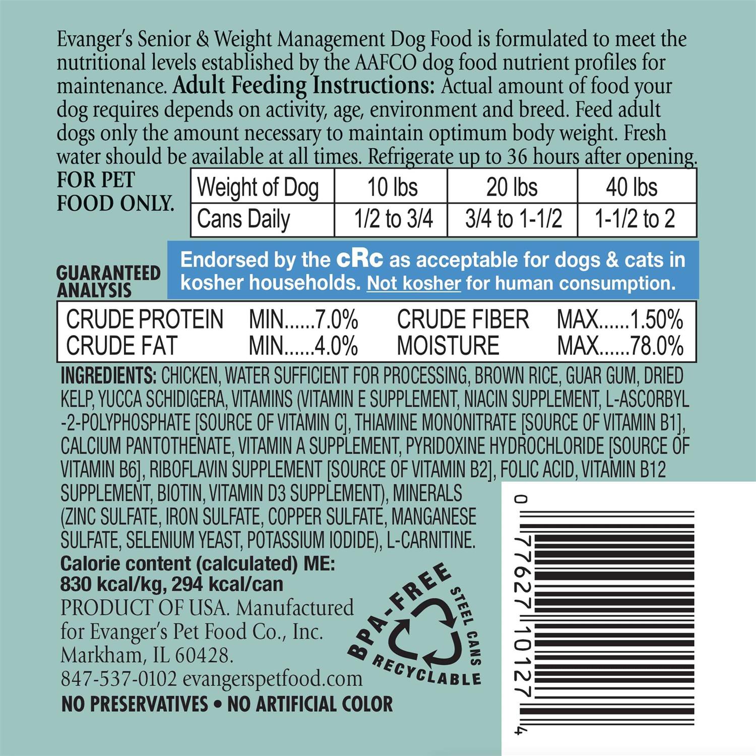 Evanger's Heritage Classic Senior Weight Management Wet Dog Food - Pet Supplies online store