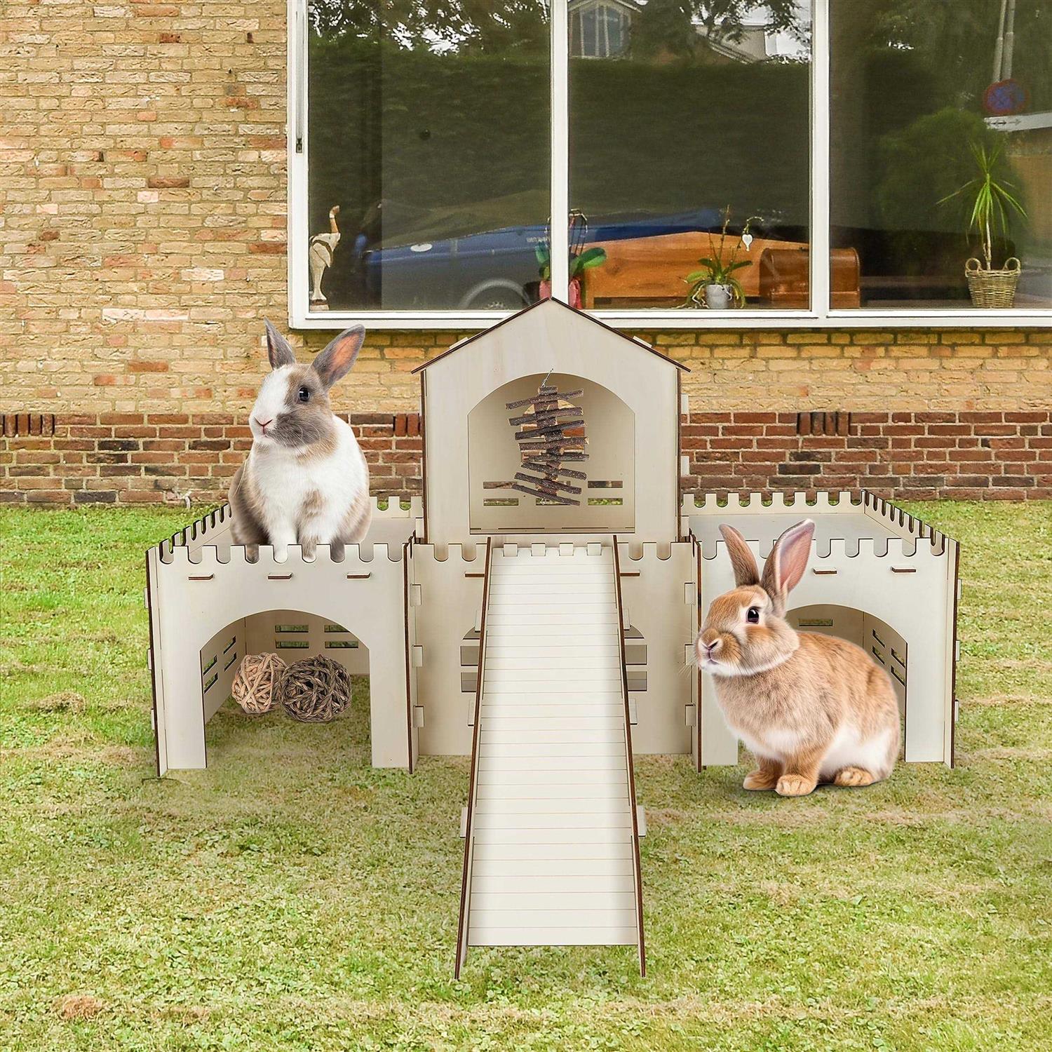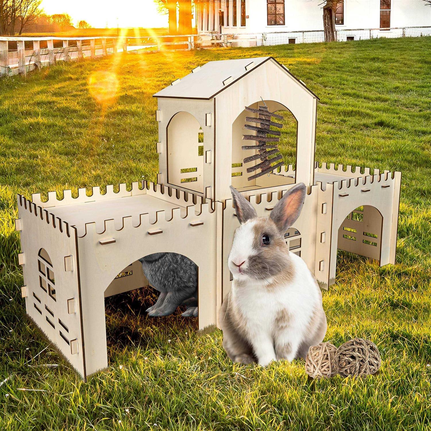 Cour Pets Large Rabbit Castle & Chew Toys Set of Wooden Rabbit Hideout with 3 Chew Toys & Staircase - Pet Supplies online store