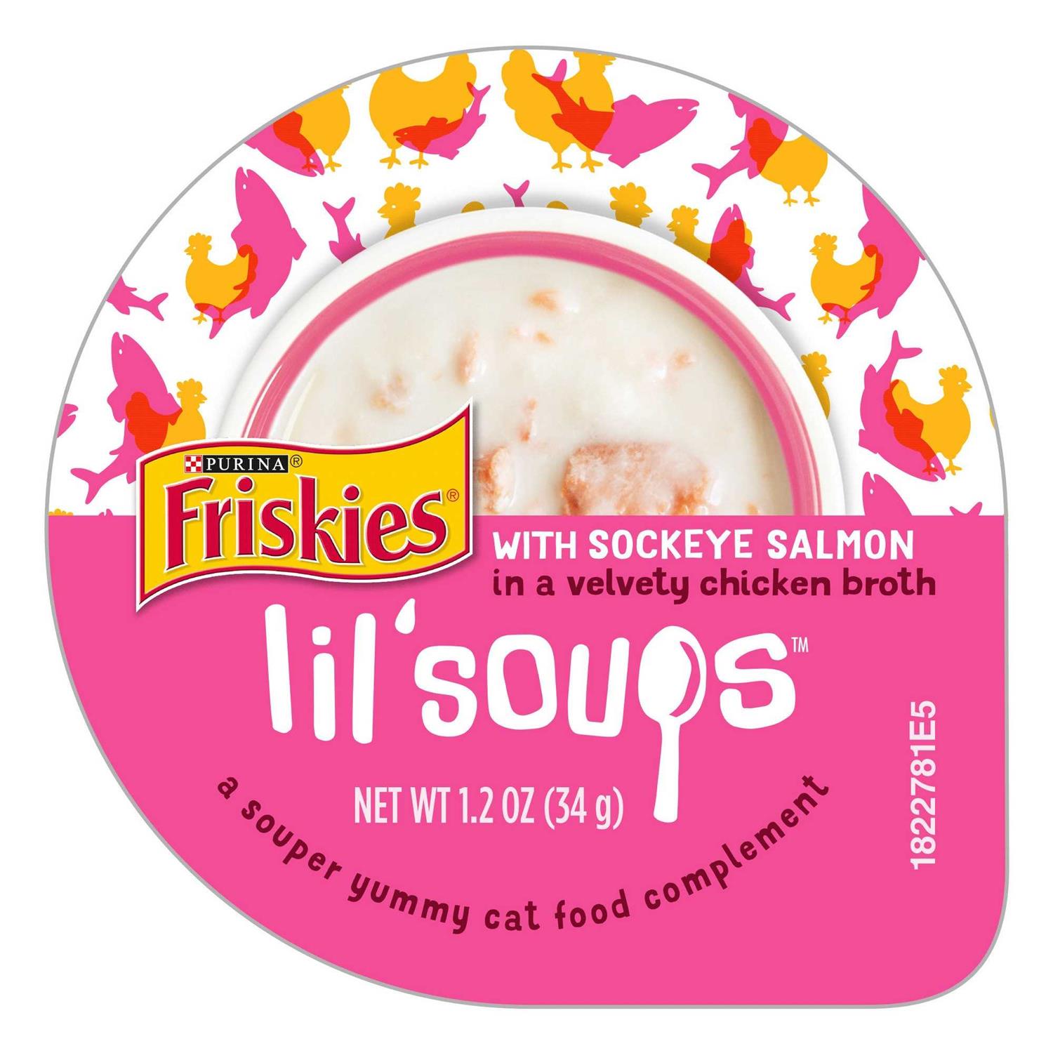 Friskies Lil' Soups with Sockeye Salmon in a Velvety Chicken Broth Lickable Cat Food Topper, 1.2-oz cup, case of 8 - Pet Supplies online store