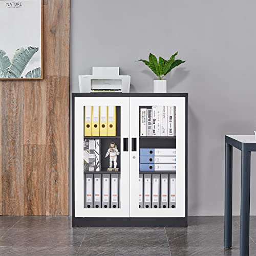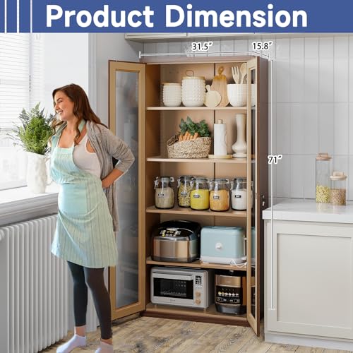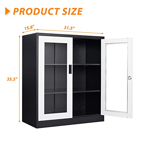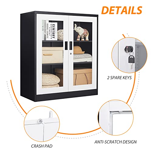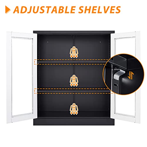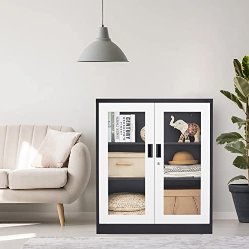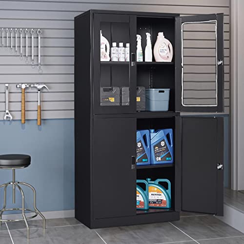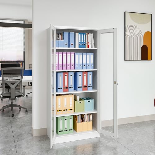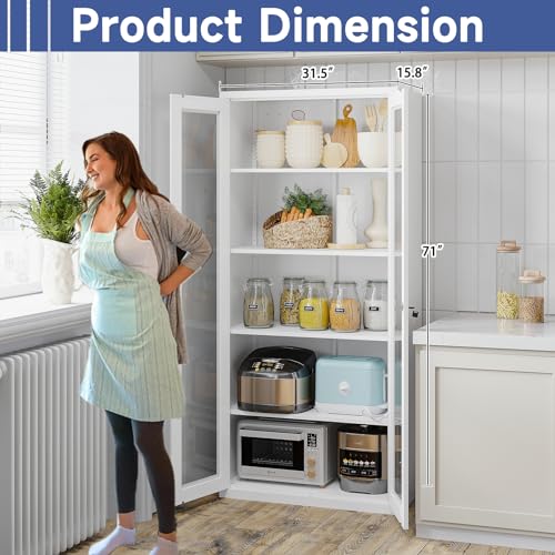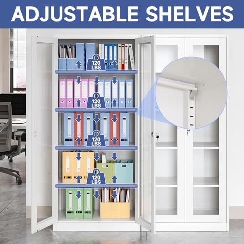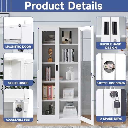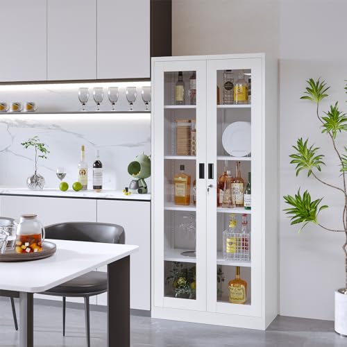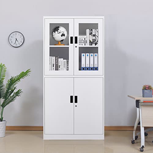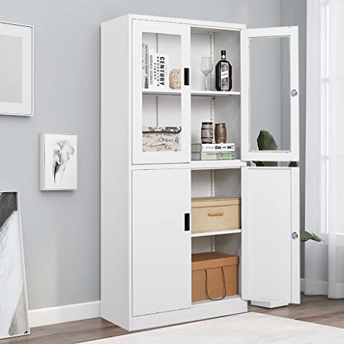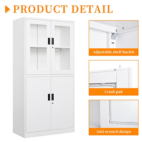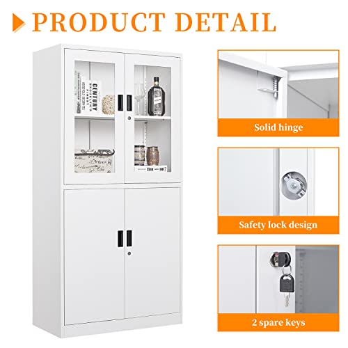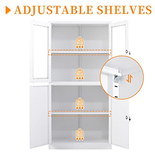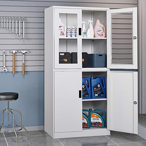 Metal Storage Cabinet with Doors and Shelves, 71" Locking Steel Cabinet with Tempered Glass Door, 2 Adjustable Shelves, 4 Doors for Home, Garage Storage (White)