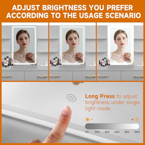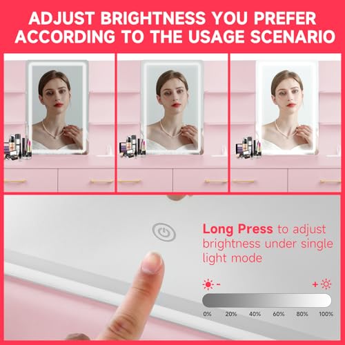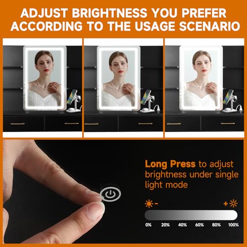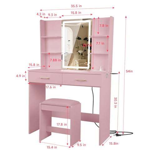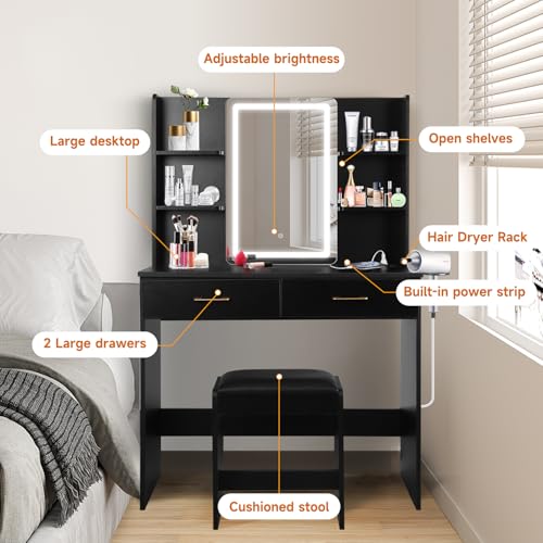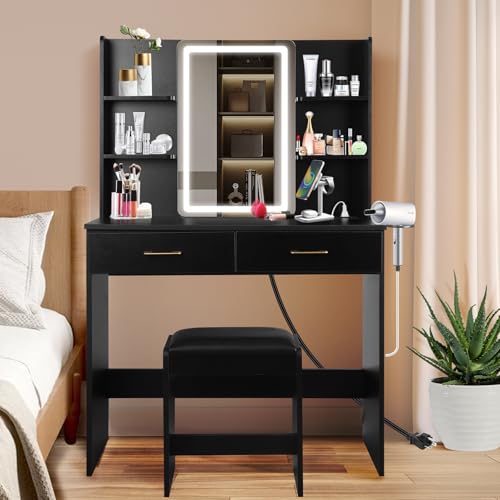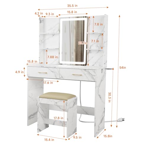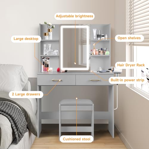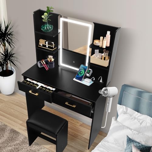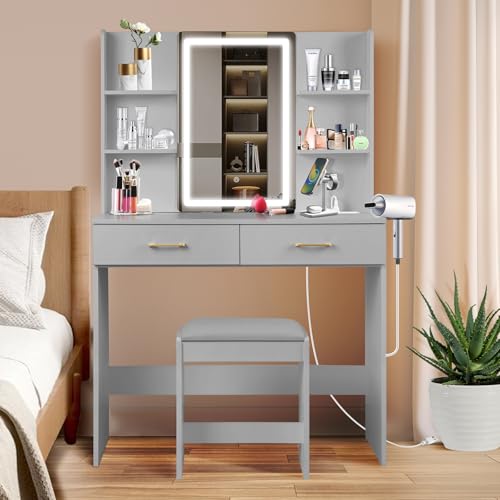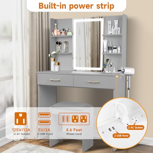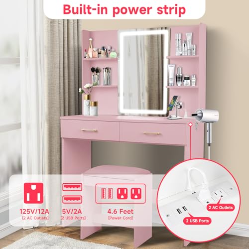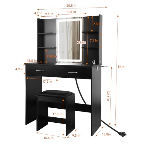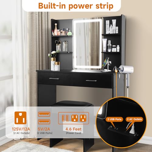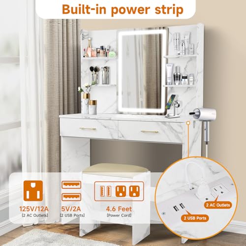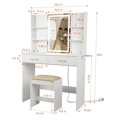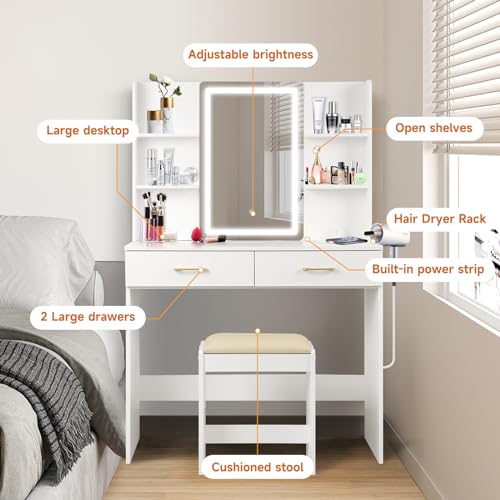 Vanity Set with Lights and Stool, Vanity Desk with Mirror and Lights,Vanity Power Outlet,Vanity Desk with Drawers, White Vanity with Lighted Mirror,Dressing Table Set with 2 Large Drawers