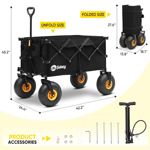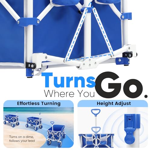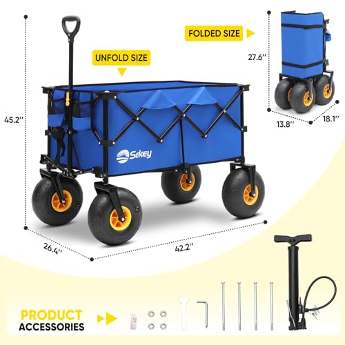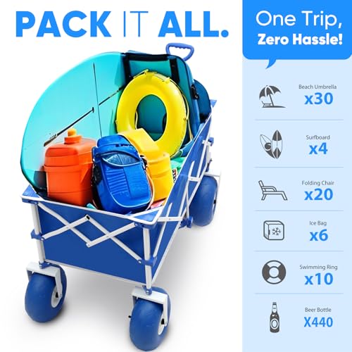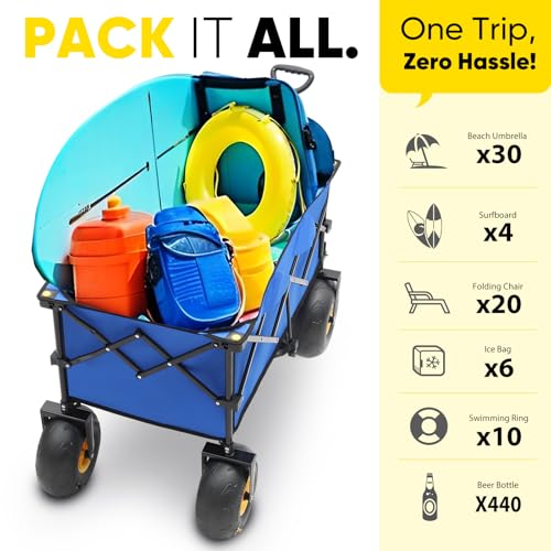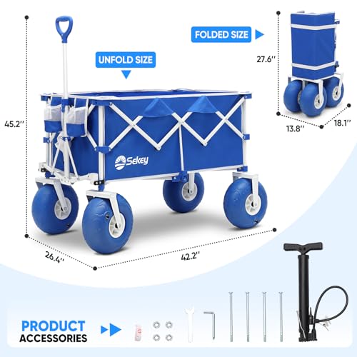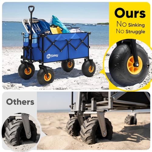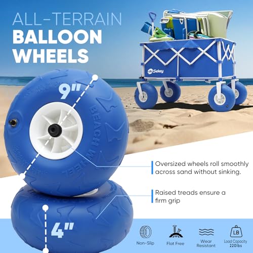 Heavy Duty Beach Wagon with 9" Big Sand-Proof Wheels – 440lb Capacity, Sekey 200L Oversized Foldable Cart | Adjustable Handle & All-Terrain Tires for Sand, Camping, Groceries. Blue&White