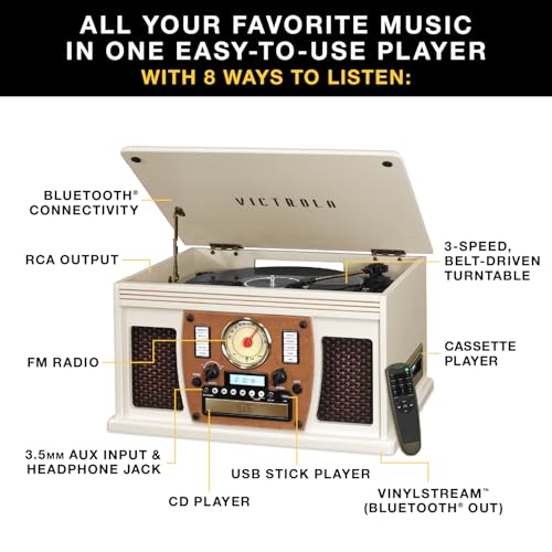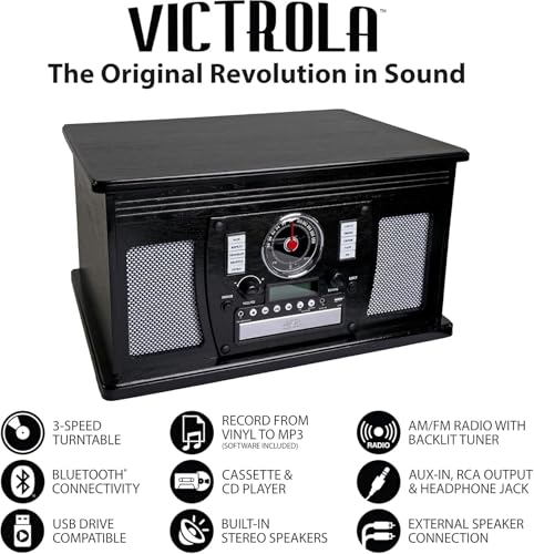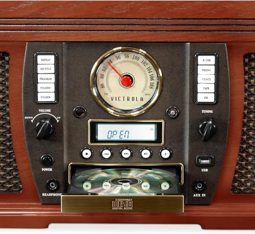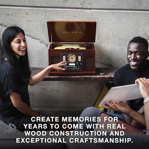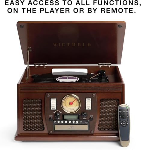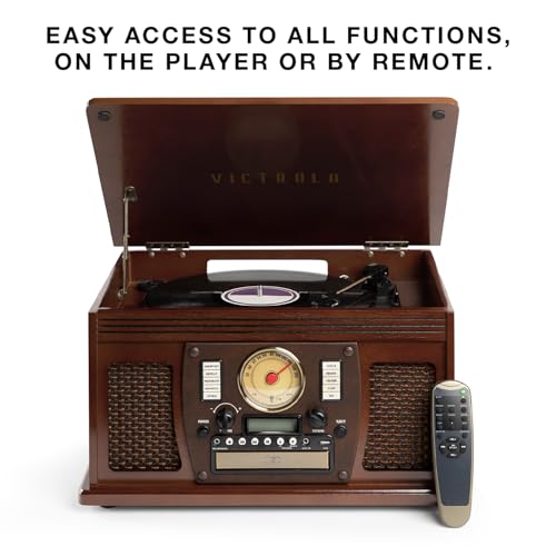 Victrola Navigator 8-in-1 Bluetooth Record Player with Built-in Speakers– 3 Speed Turntable, CD Player, Cassette, FM Radio, USB, RCA Out, Headphone Jack, Wireless Music Streaming, Real Wood (Mahogany)