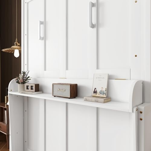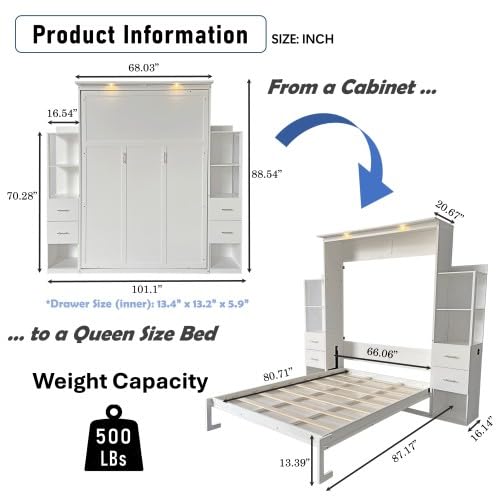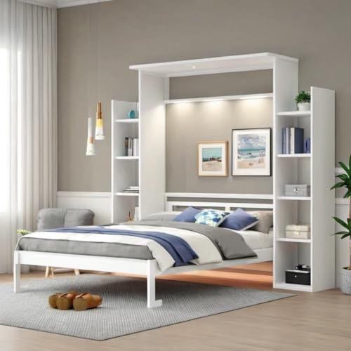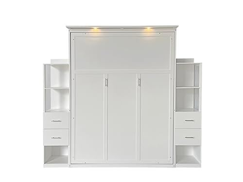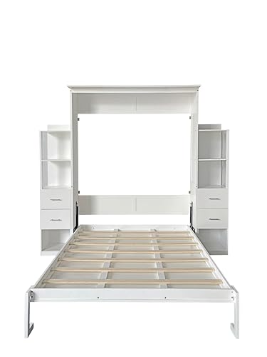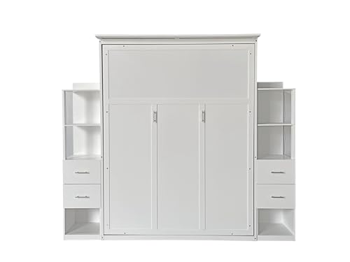 Queen Size Murphy Bed Wall Bed with 2 Side Cabinet Storage Shelf & Desk Combo,68-inch Vertical Wall Bedframe w/Can Be Folded for Bedroom Guest Room Small Space, White