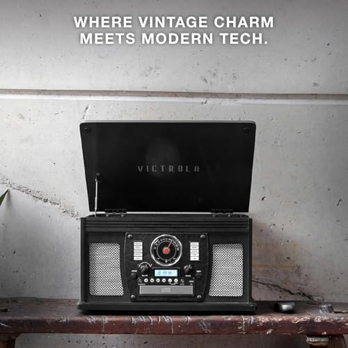 LoopTone Vinyl Record Player 10 in 1 3 Speed Bluetooth Vintage Turntable CD Cassette Player AM/FM Radio USB Recorder Aux-in RCA Line-Out (Black-Grey)