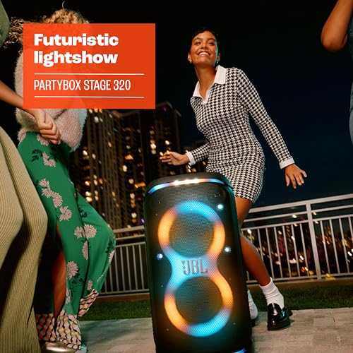 JBL PartyBox Stage 320 - Portable Party Speaker with Telescopic Handle & Wide, Sturdy Wheels, Powerful JBL Pro Sound, Futuristic lightshow, Up to 18 Hours of Play time, Splash Proof (Black)