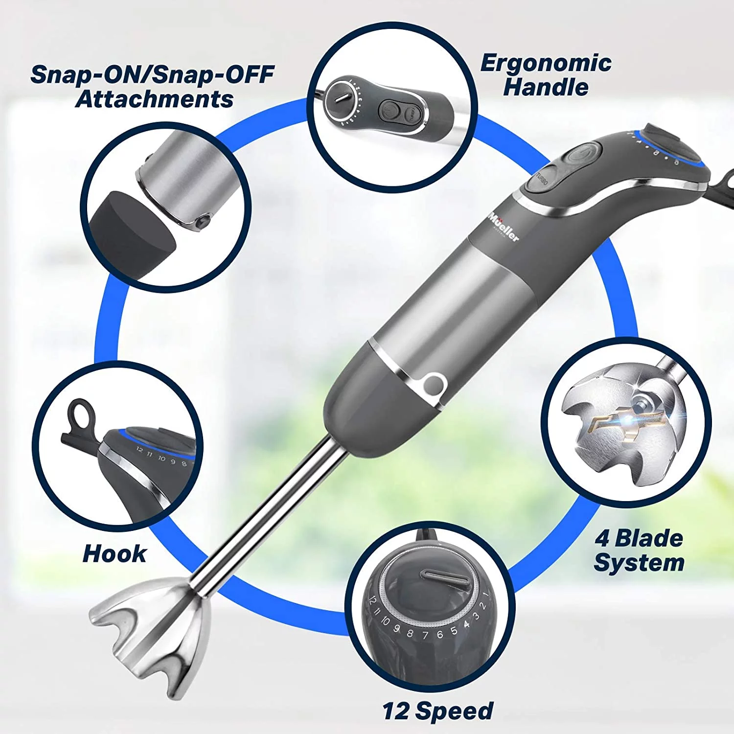 Mueller Austria Hand Blender, Smart Stick 800W, 12 Speed and Turbo Mode, 3-in-1, Titanium Steel Blades, Comfygrip Handle, with Whisk, Chopper/Grinder Bowl and Beaker/Measuring Cup
