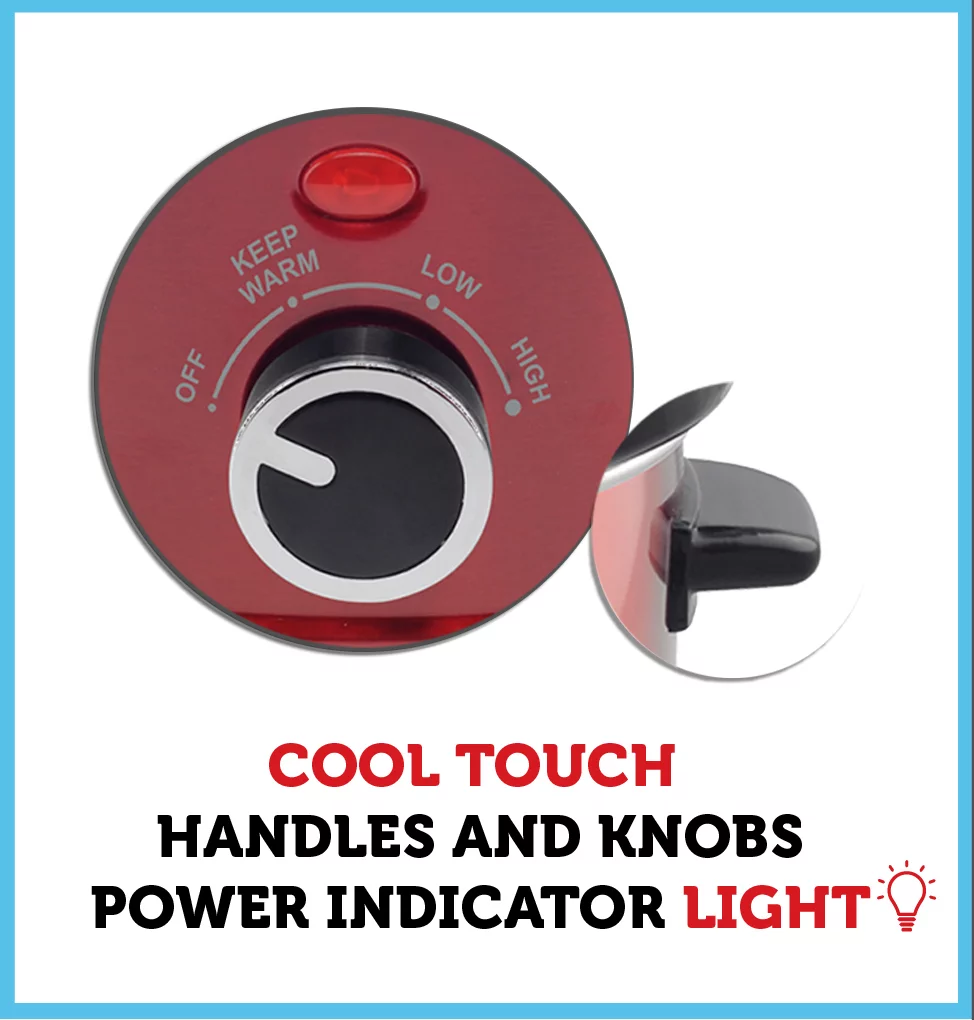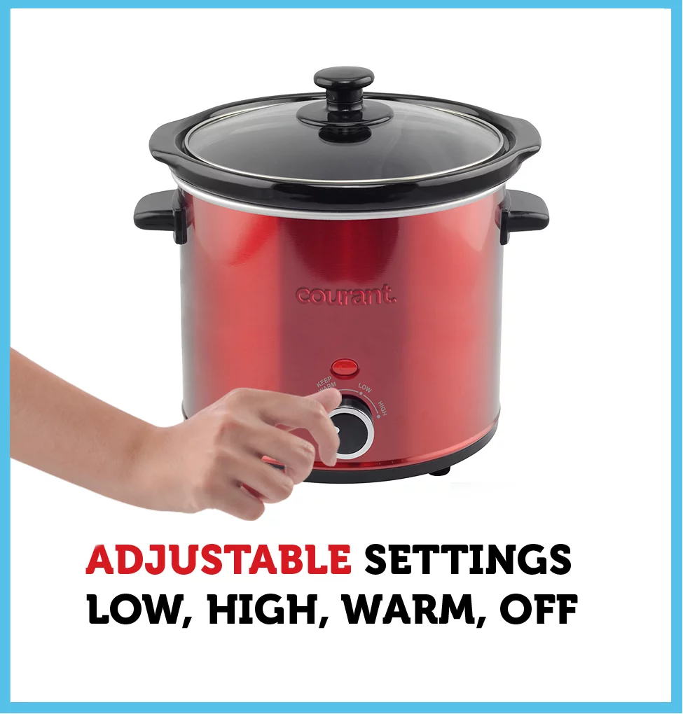 Courant Slow Cooker 3.2 Quart Crock Dishwasher Safe Stainproof Pot and Glass Lid, Round Manual Slow Cooker, Red Stainless Steel