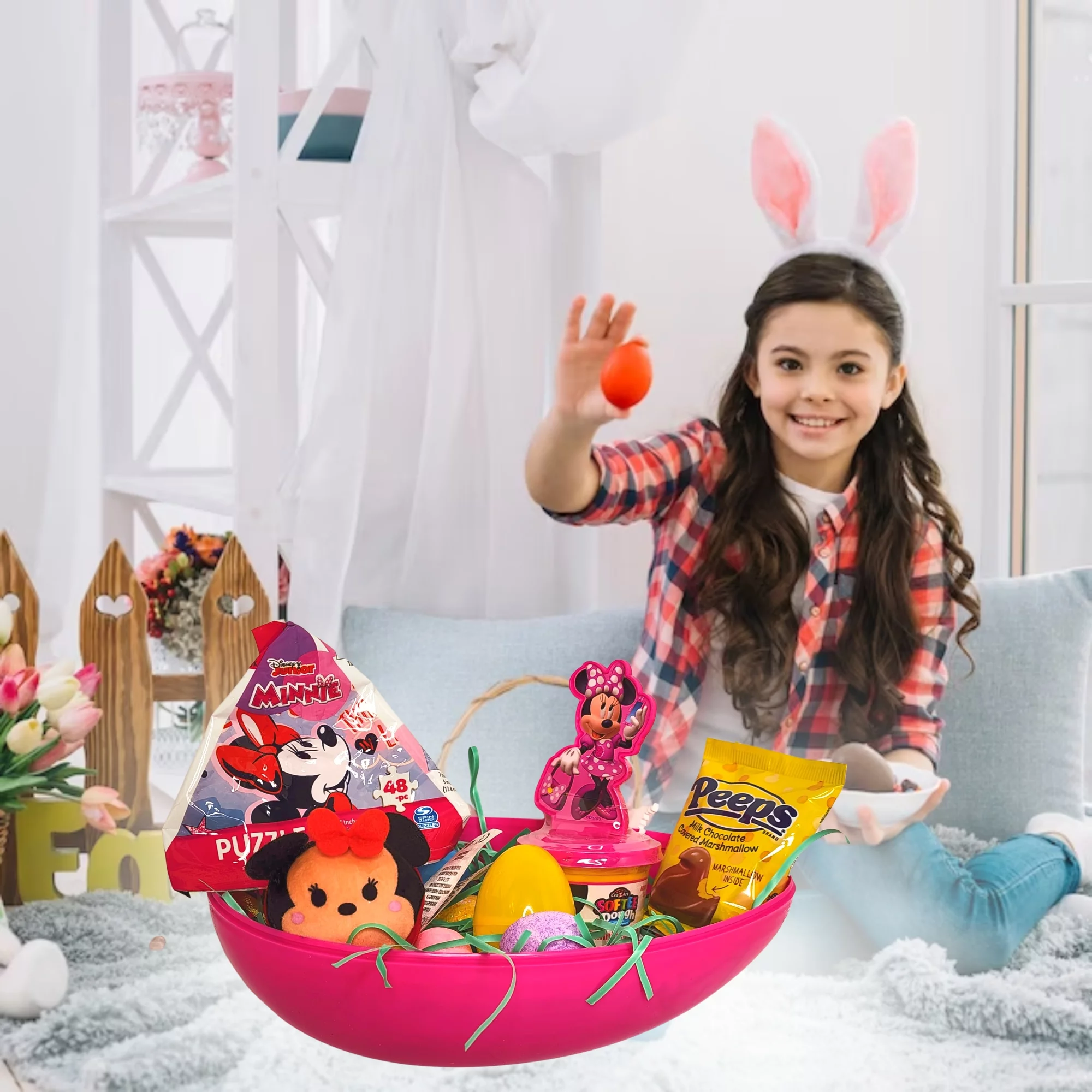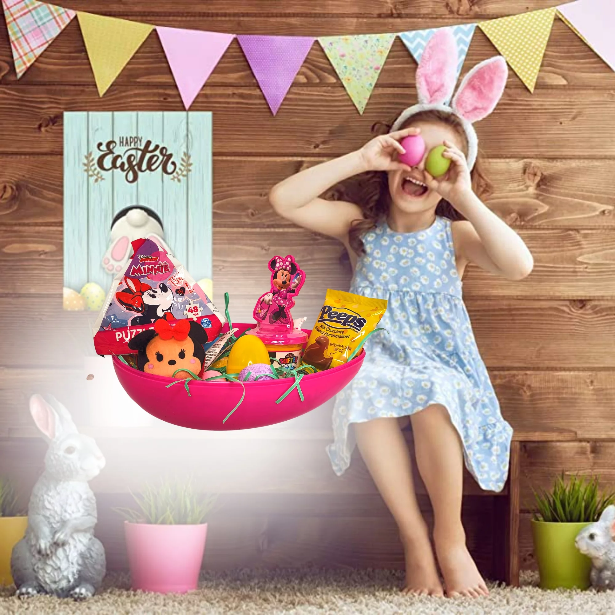 Happy Easter Basket Pre-Filled Surprise Jumbo Egg w/ Minnie Mouse Plush Toy Kiddy Dough Figure Eggs Candies Gift & Reusable Plastic Egg-Shaped Container Kids Spring Party Favor ( Contents May Vary)