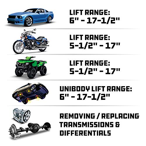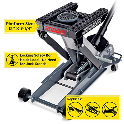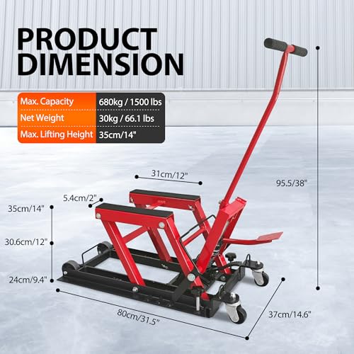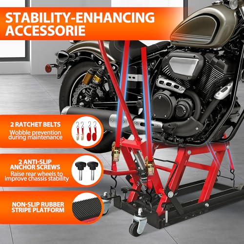 Hydraulic Motorcycle Lift Jack, 1500 LBS Capacity Motorcycle Jack Stand with Wheels and T- Bar Handle, Solid Steel ATV Jack Hydraulic Lifts for Motorcycles UTV Dirt Bike Powersports, 2 Ratchet Belts