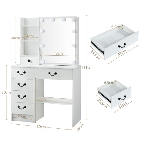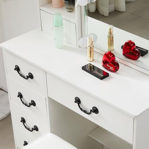 Vanity Desk with Mirror & Light,Makeup Vanity Table with Power Strip,Dressing Table Set with Large Drawers, White (VAN-07)
