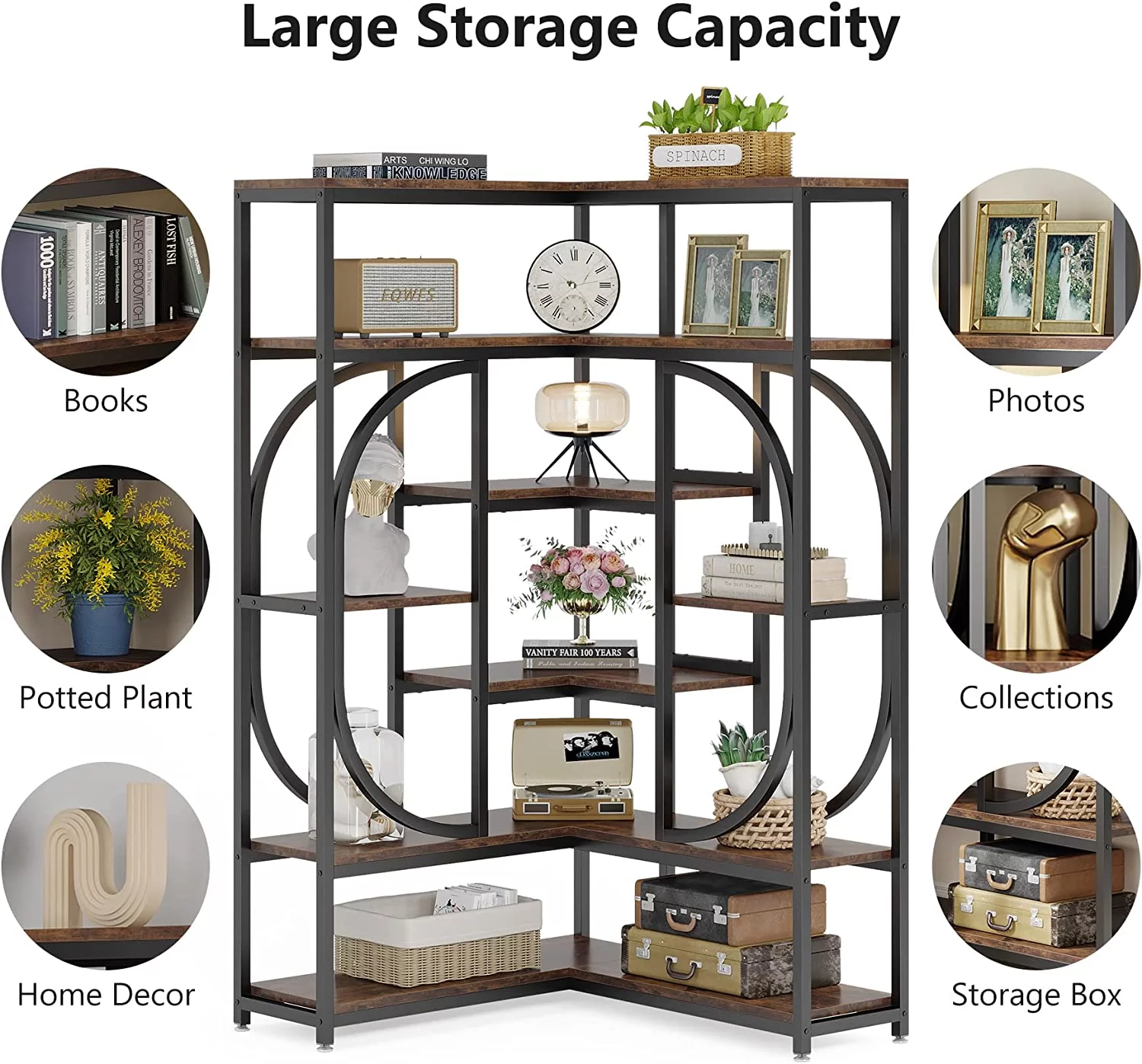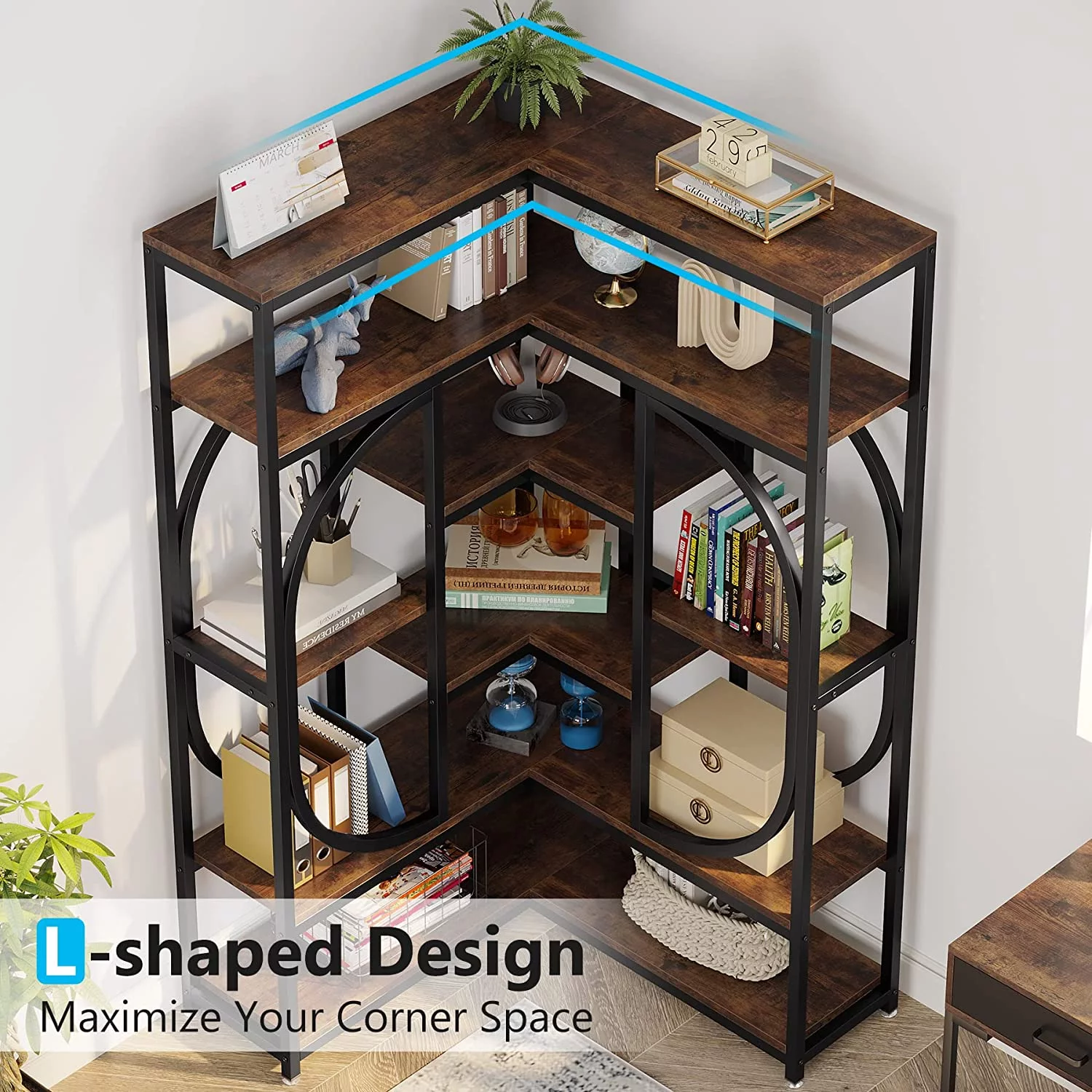 Tribesigns L Shaped Corner Bookshelf, Large 7 Shelf Corner Bookcase Display Rack for Home Office, Rustic Brown & Black