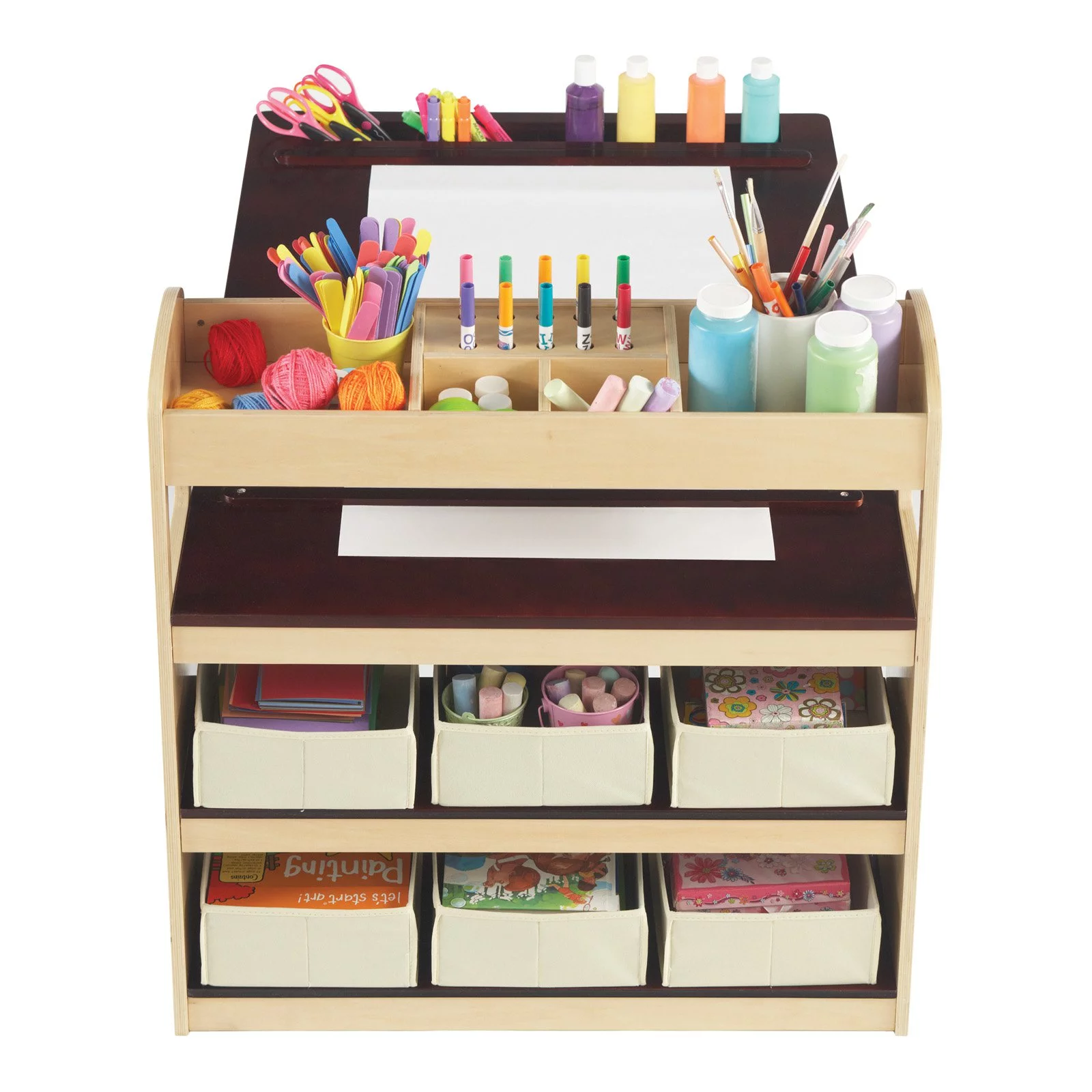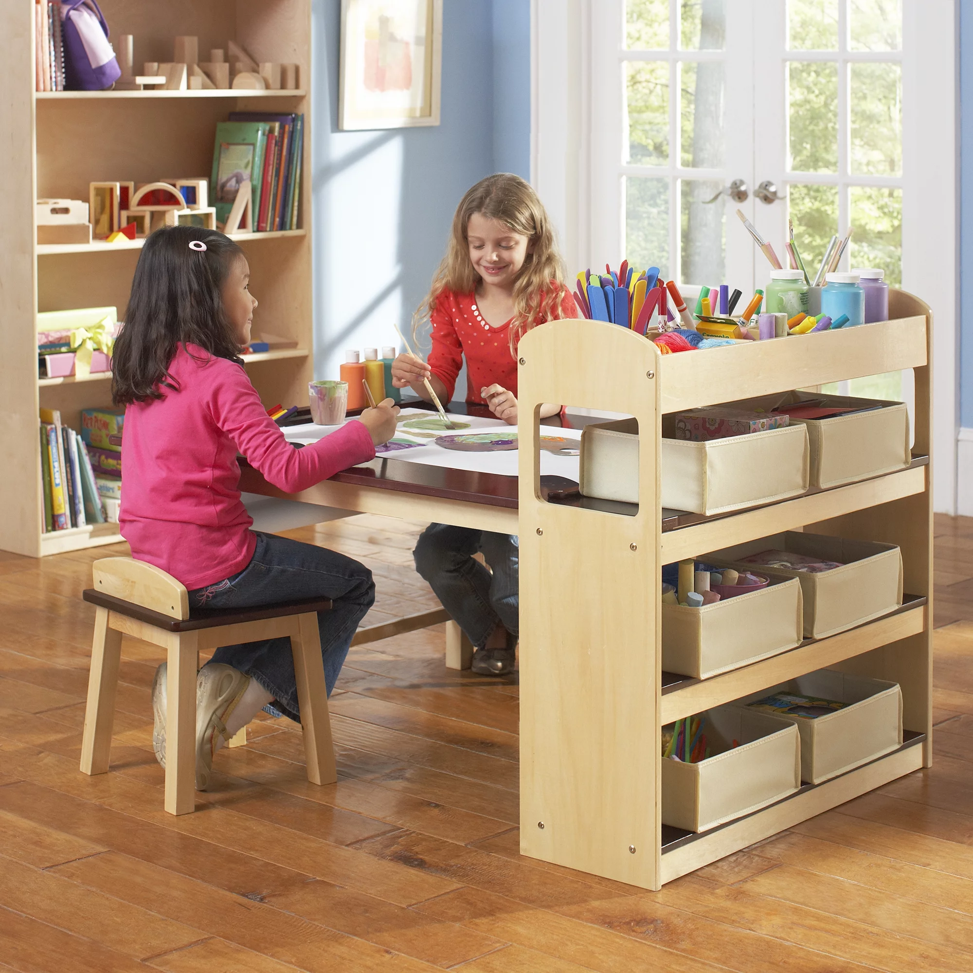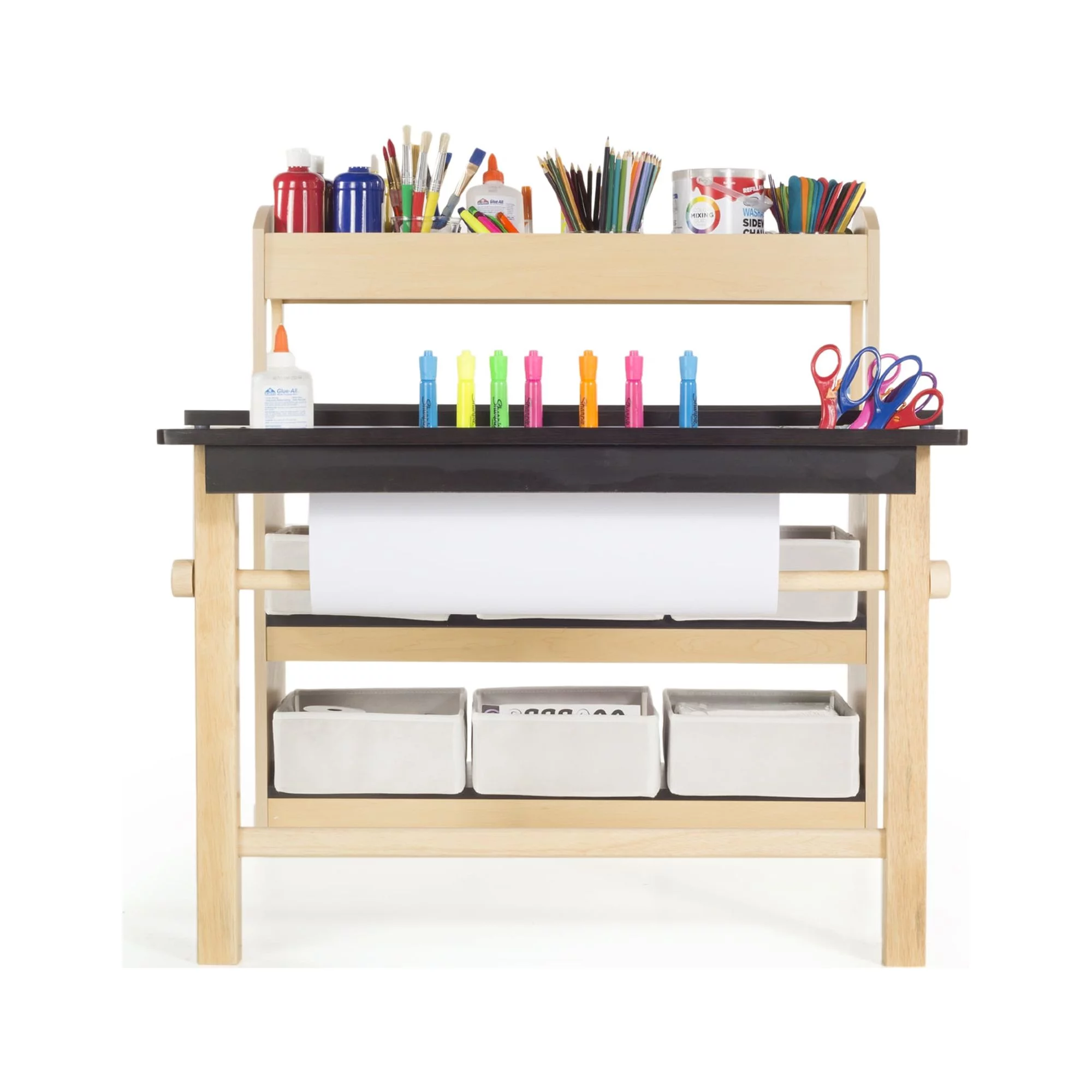 Guidecraft Deluxe Art Center: Drawing Desk and Painting Table for Kids, W/ Two Stools, Craft Supplies Storage Shelves, Canvas Bins, Paper Roll – Preschool Toddler Wooden Learning Furniture