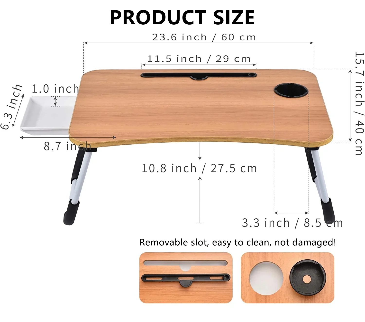 LEUCHTA Foldable Lap Desk, 23.6 Inch Portable Wood Laptop Desk Table Workspace Organizer Bed Tray with iPad Slots, Cup Holder and Drawer, Anit-Slip for Working Reading Writing, Eating, Watching-Walnut