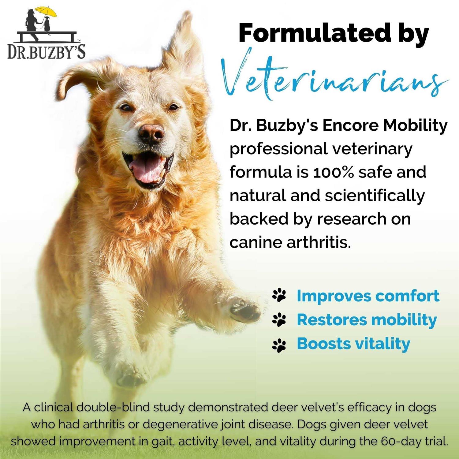 Dr. Buzby's Encore Mobility Hip & Joint Supplement for Senior Dogs, 90 Chewable Tablets, Natural New Zealand Deer Velvet and Green Lipped Mussel - Pet Supplies online store
