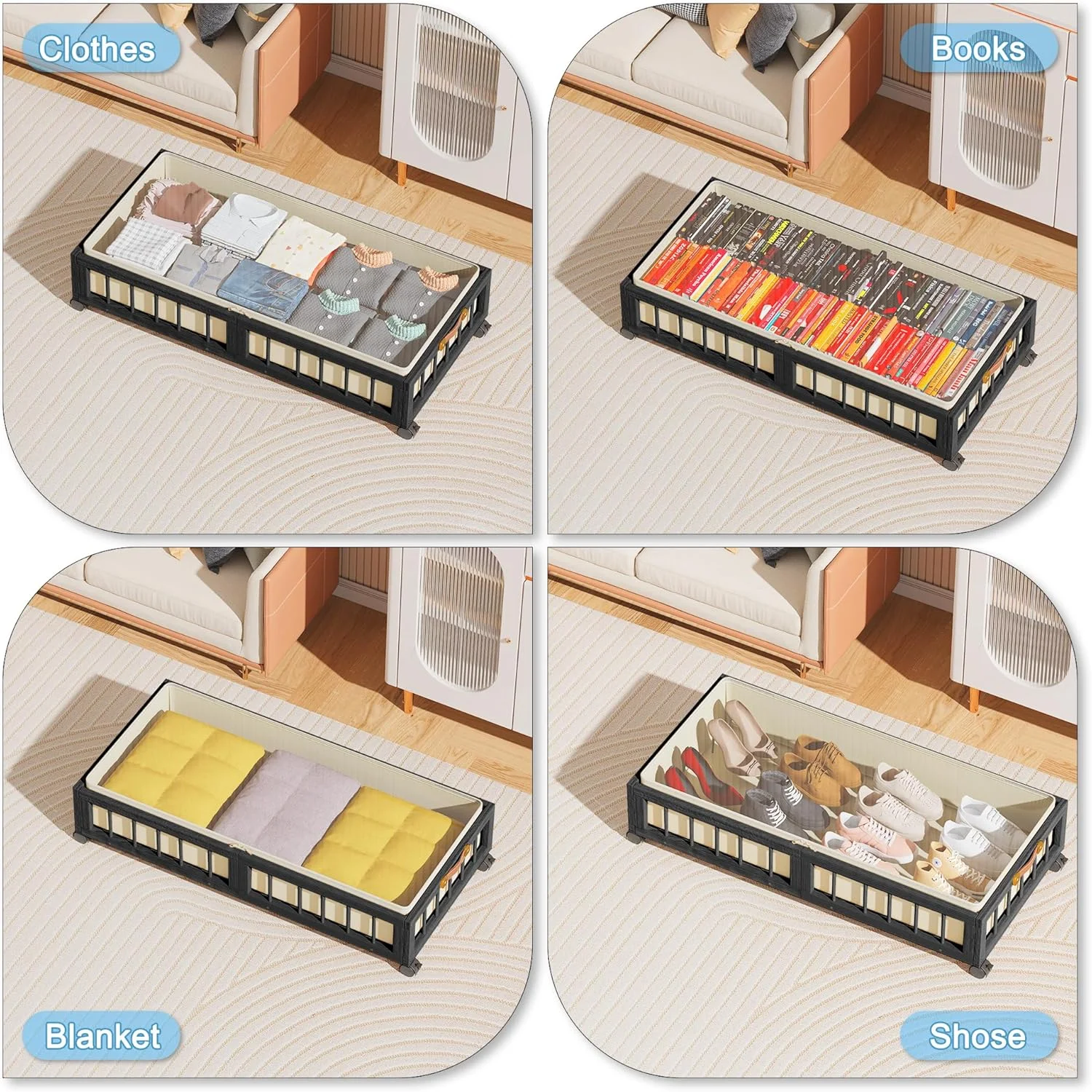 Under Bed Shoe Storage Organizer with Sturdy Handles and Clear Window Premium Foldable Underbed Shoes Container Box for Closet, Linen-like Black