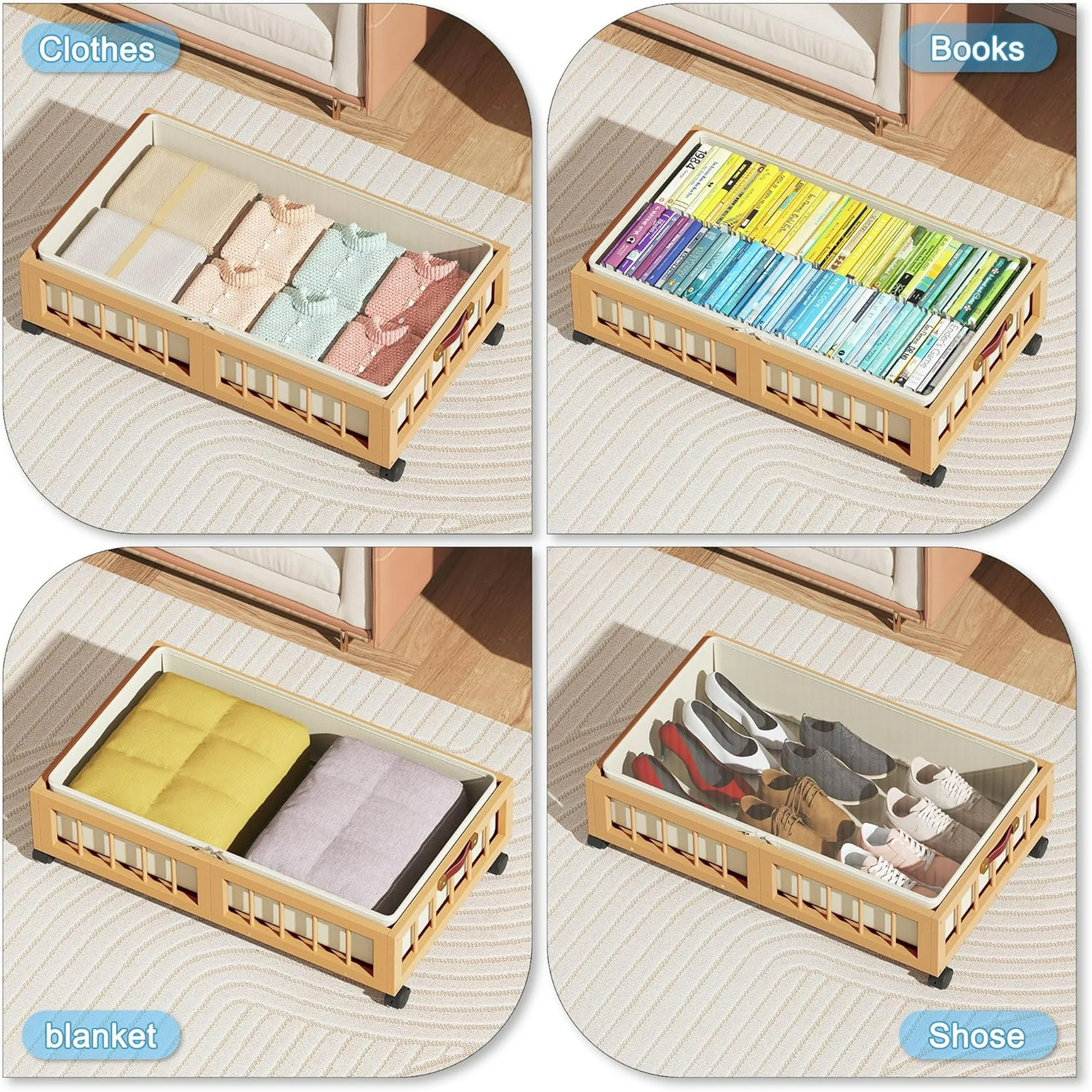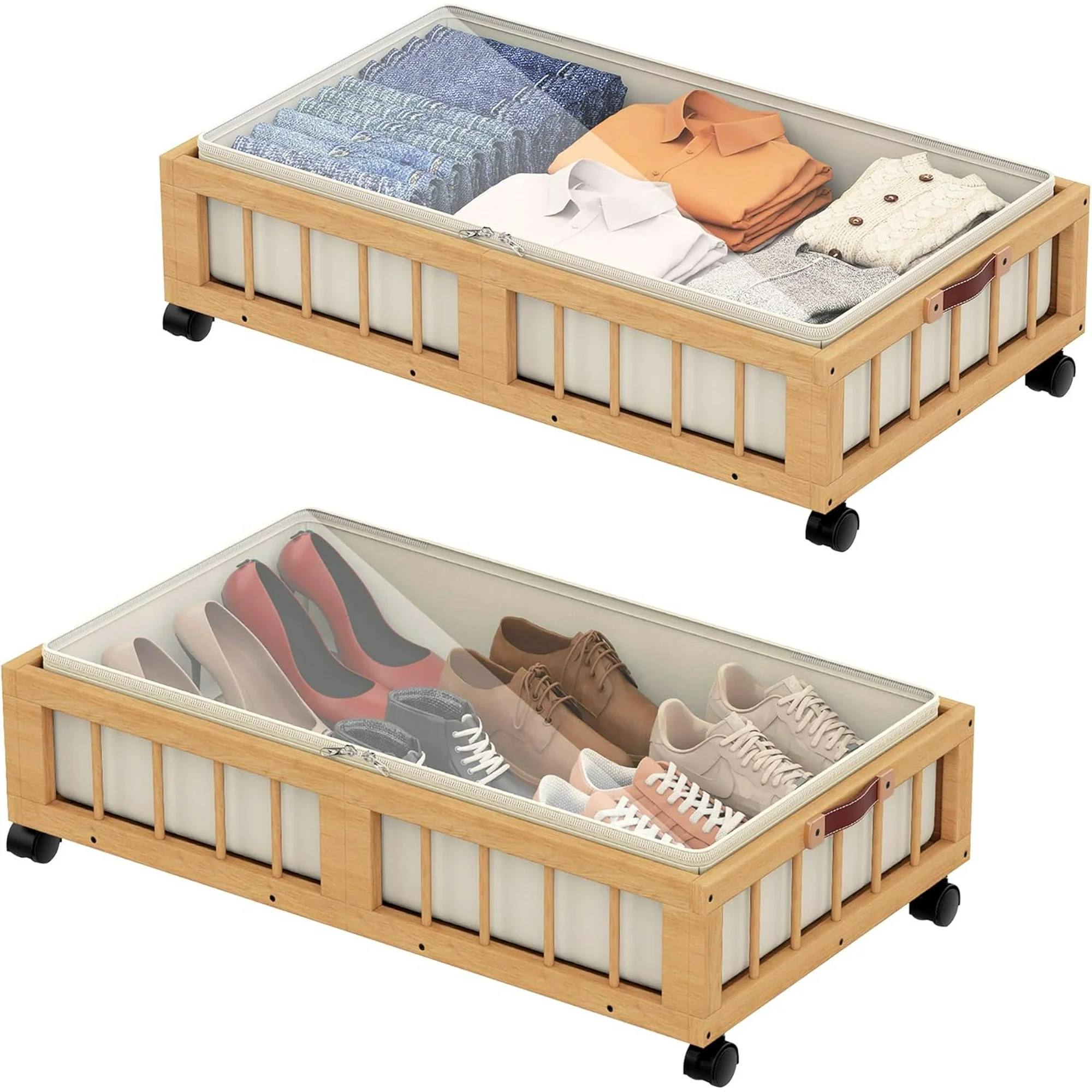 2-Pack Bamboo Under Bed Storage Containers with Wheels, Under Bed Clothes Storage Basket with Large Dust Bag, Rolling UnderBed Storage for Bedroom, Dorm and Basement, Nature