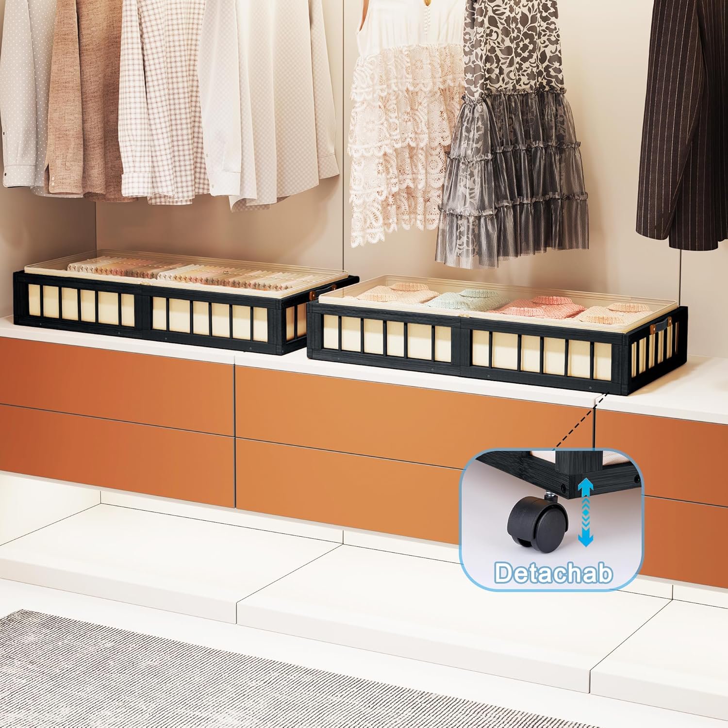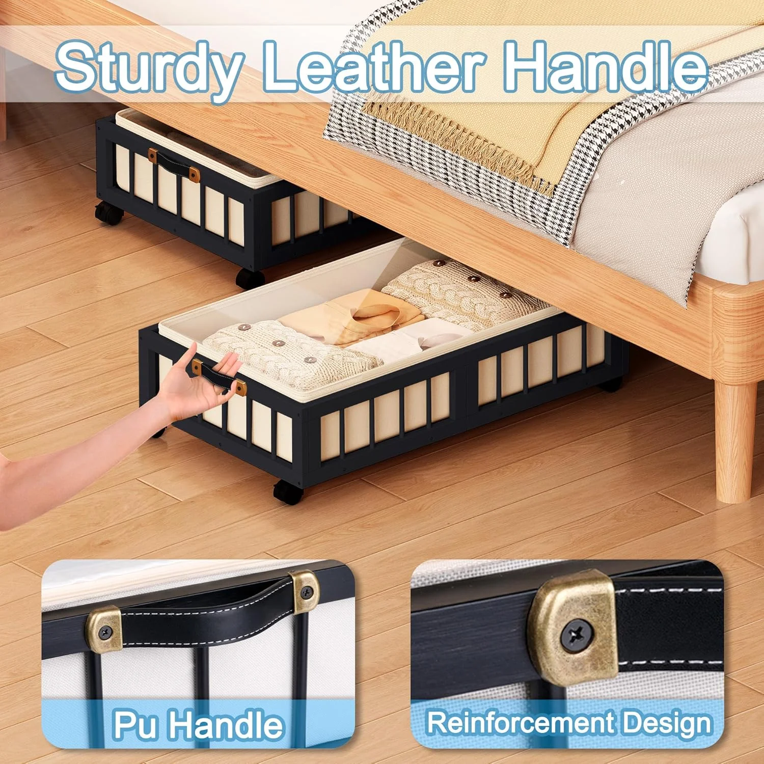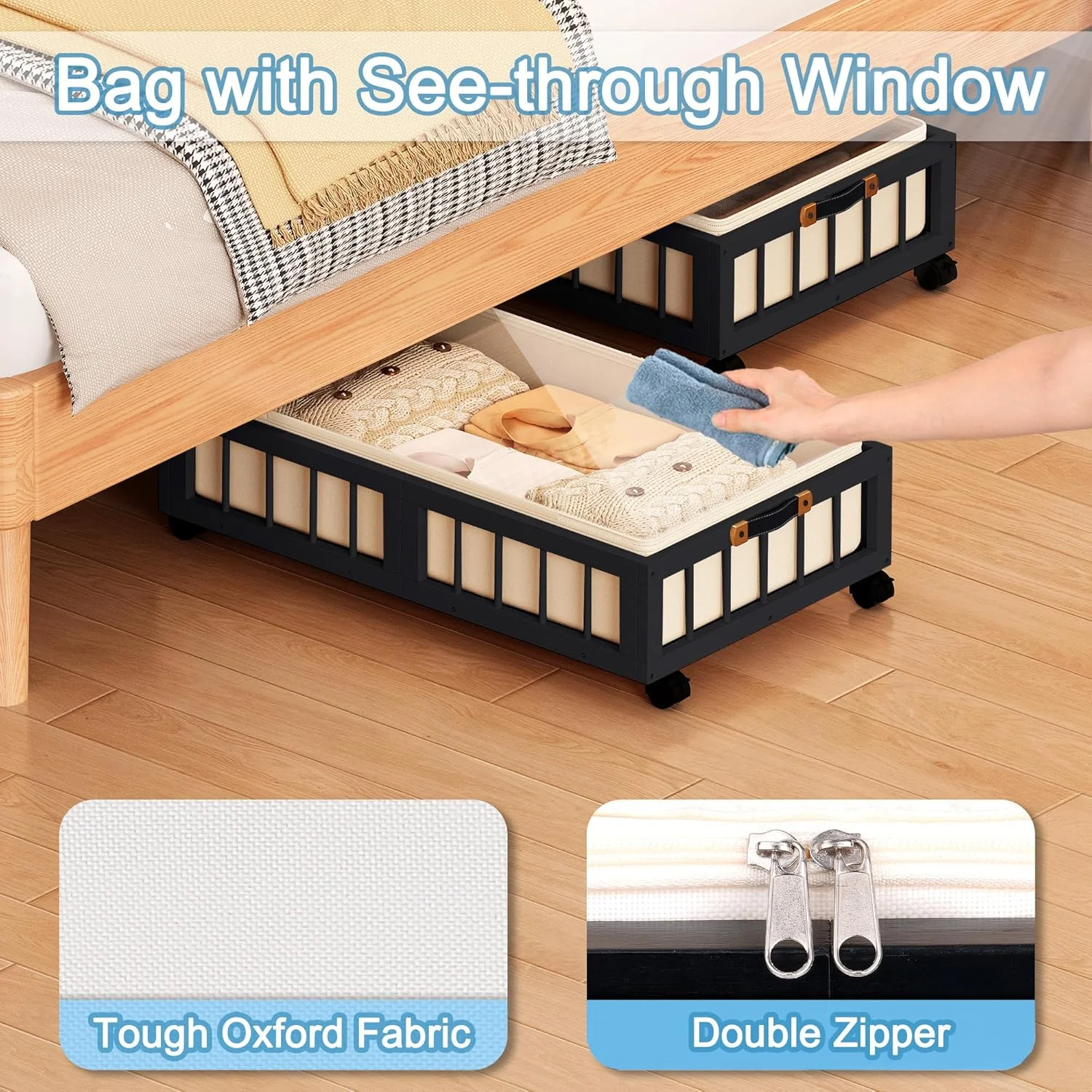 2-Pack Bamboo Under Bed Storage Containers with Wheels, Under Bed Clothes Storage Basket with Large Dust Bag, Rolling UnderBed Storage for Bedroom, Dorm and Basement, Black