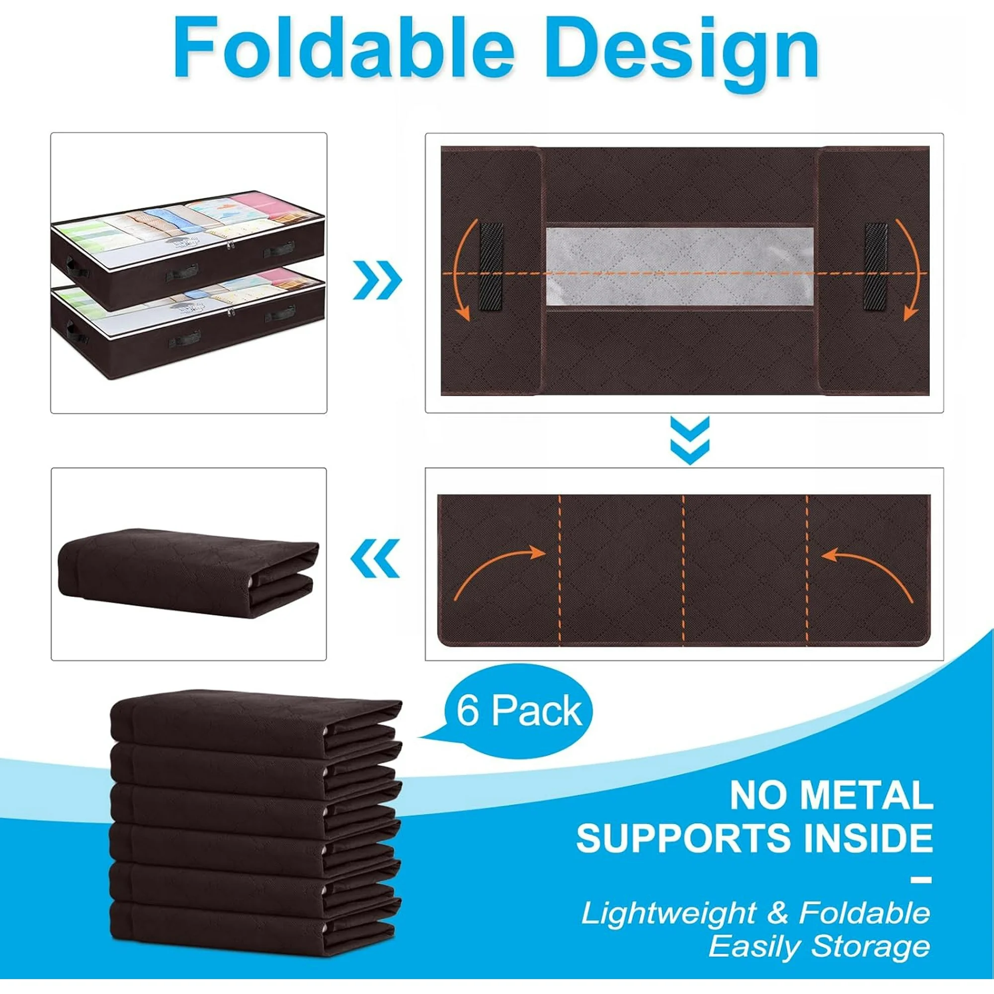UniMall 6 Pack 90L Under bed Storage Containers Organizer Large Capacity Underbed Clothes Storage Bins Organization and Storage Bedroom Foldable Storage Bags with Clear Window Brown