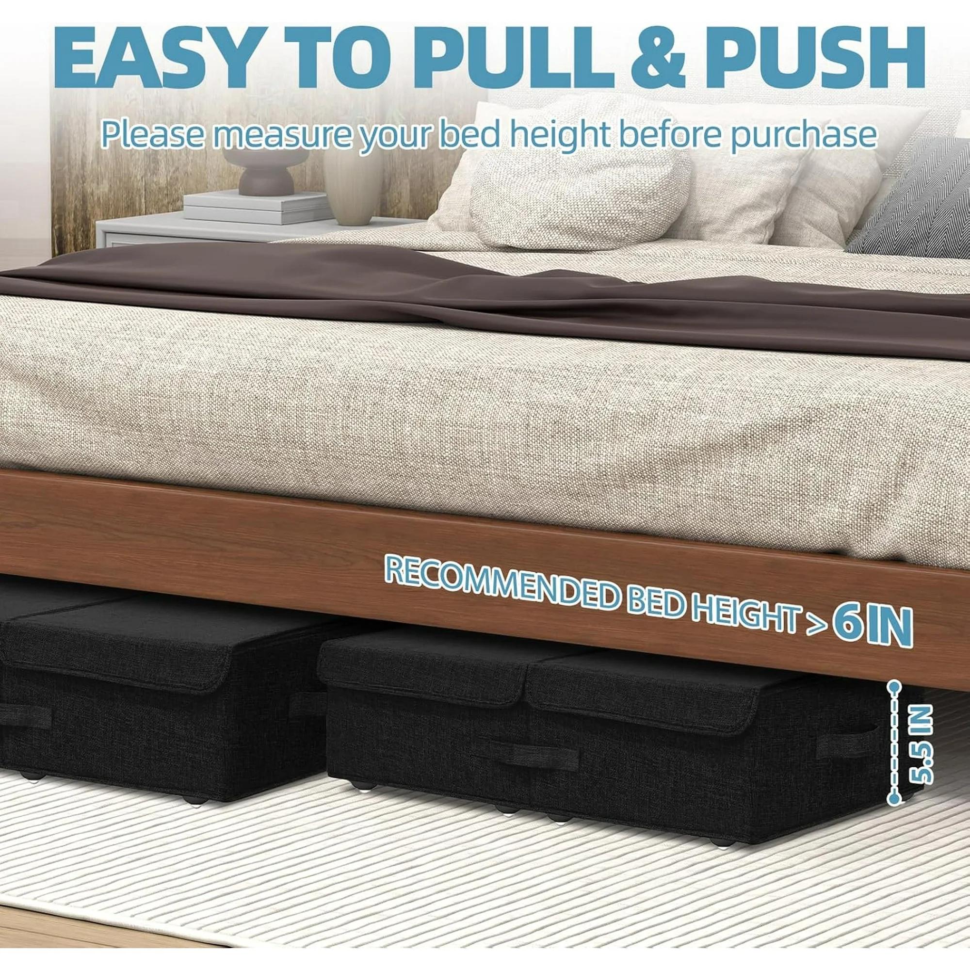 Under Bed Storage Container with Wheels, 2 Pack 5.5 High Deep Underbed Rolling Box Storage Bins Drawers with Lids for Bedroom, Dorms, Clothes, Shoes, Blankets, No Assemble Required, Black